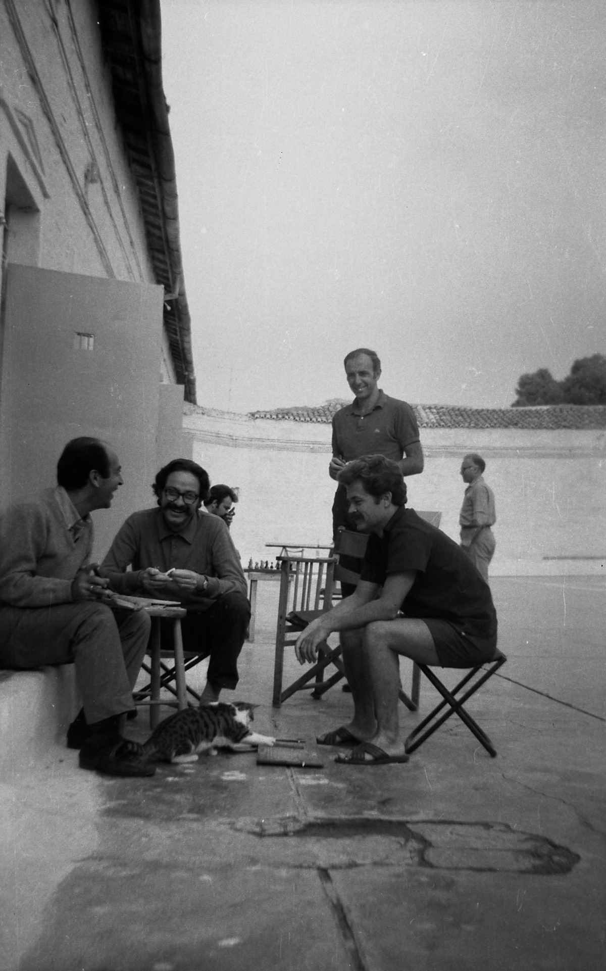 Ο Δ. Μανιάτης μού ζήτησε φωτογραφίες και επιλέξαμε δύο: Η πρώτη είναι μία από τις ωραιότερες από το αρχείο του Φοίβου, βγήκε από μια μηχανούλα που κατάφερε να βάλει λαθραία στην Αίγινα και δείχνει στο προαύλιο των φυλακών μια χαρούμενη στιγμή όπου πρωταγωνιστούν ο ίδιος και οι Παύλος Ζάννας, Βίκτωρ Παπαζήσης, Σωτ. Δέδες, Κώστας Πύρζας, Χαρ. Πρωτοπαπάς και μια γάτα που παίζει ζωηρά με ένα φανταστικό αντίπαλο. Η άλλη συνοδεύει μια ανάμνησή μου πολύ ιδιαίτερη. Πριν από καμιά δεκαριά χρόνια, ίσως και λίγο παραπάνω, αν καλά θυμάμαι στη φάση που ο Φοίβος σκεφτόταν ή είχε μόλις αποχωρήσει από την πολιτική, τού ανέφερα ότι οι φυλακές Αίγινας, που είχαν κλείσει από χρόνια ήταν επισκέψιμες καθώς είχαν μετατραπεί σε καταφύγιο αγρίων ζώων. Θέλησε να πάμε. Μια μέρα μουντή, σαν σε ταινία του Αγγελόπουλου, μπήκαμε στο καράβι, φτάσαμε στην Αίγινα, μπήκαμε στα κτίρια που ήταν σε κατάσταση εγκατάλειψης. Σπάνια τον έχω δει τόσο σφιγμένο και αμίλητο. Μας υποδέχτηκε ένας τύπος κάπως βαριεστημένος και ανόρεχτος, του εξηγήσαμε και έμεινε αδιάφορος. Μου φάνηκε περίεργο που κάποιος που ασχολείται με την περίθαλψη αγρίων ζώων δεν έδειχνε κανένα ενδιαφέρον που ένας πολιτικός κρατούμενος επέστρεφε μετά από δεκαετίες να δει τον τόπο όπου στερούνταν την ελευθερία του για τέσσερα χρόνια.