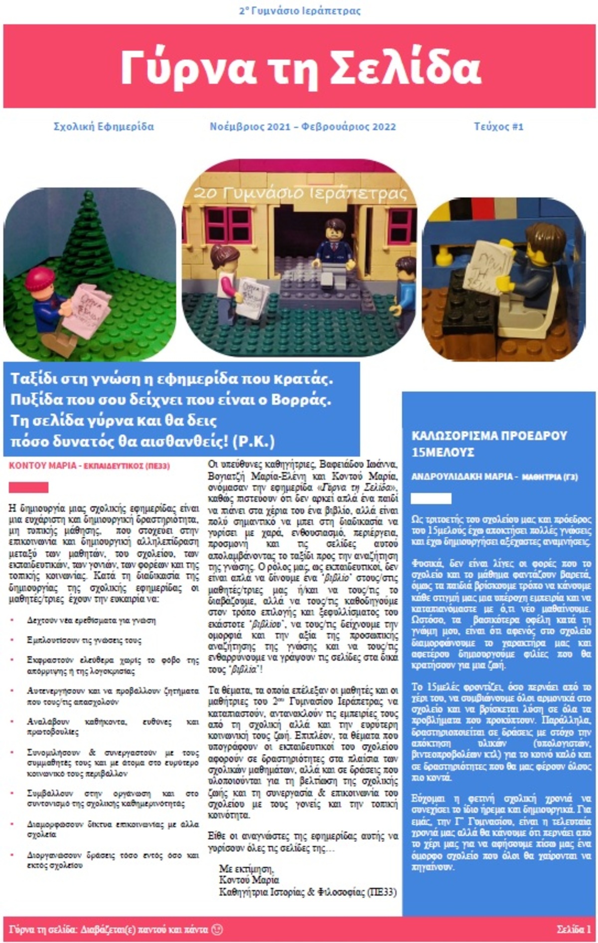 Κατά τη διάρκεια της δημιουργίας του πρώτου τεύχους της εφημερίδας του σχολείου μας, δόθηκε έμφαση σε νέες δράσεις που λαμβάνουν χώρα στις σχολικές αίθουσες, αλλά και στις δράσεις που έχουν σχεδιαστεί με σκοπό να ενισχυθούν οι επικοινωνιακές, οργανωτικές και κοινωνικές δεξιότητες των μαθητών/τριών του σχολείου. Η σχολική εφημερίδα είναι ένας ιδιαίτερα εποικοδομητικός τρόπος οι μαθητές να εκφραστούν ελεύθερα, να κινητοποιηθούν, να αναλάβουν καθήκοντα και ευθύνες, να πάρουν πρωτοβουλίες, να εμπλουτίσουν τις γνώσεις τους, να συνεργαστούν, να συνομιλήσουν με τους συμμαθητές τους αλλά και με άτομα στο ευρύτερο κοινωνικό τους περιβάλλον.