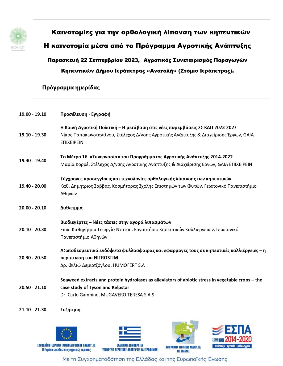 Ημερίδα με θέμα "Καινοτομίες για την ορθολογική λίπανση των κηπευτικών"την Παρασκευή 22-9 στην Ιεράπετρα ΙΕΡΑΠΕΤΡΑ 8:09 μ.μ. - Δευτέρα 18 Σεπτεμβρίου 2023 08:09 μ.μ. - Δευ, 18/09/2023 ΑΓΡΟΤΙΚΑ, ΘΕΡΜΟΚΗΠΙΟ, ΗΜΕΡΙΔΑ, ΓΕΩΠΟΝΙΚΟ ΠΑΝΕΠΙΣΤΗΜΙΟ ΑΘΗΝΩΝ, ΛΙΠΑΝΣΗ Στον αγροτικό συνεταιρισμό Ανατολή