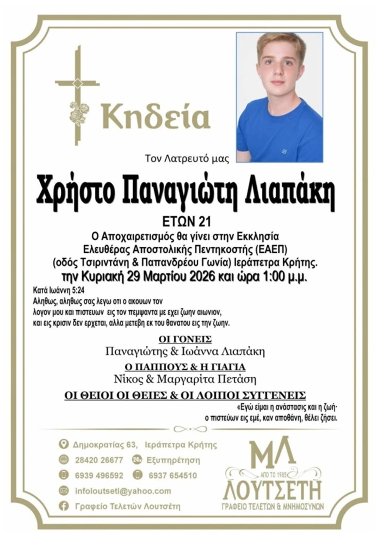 Η εξόδιος ακολουθία θα τελεστεί την Κυριακή 28 Μαρτίου στην εκκλησία Ελευθέρας Αποστολικής Πεντηκοστής, παρουσία συγγενών και φίλων.