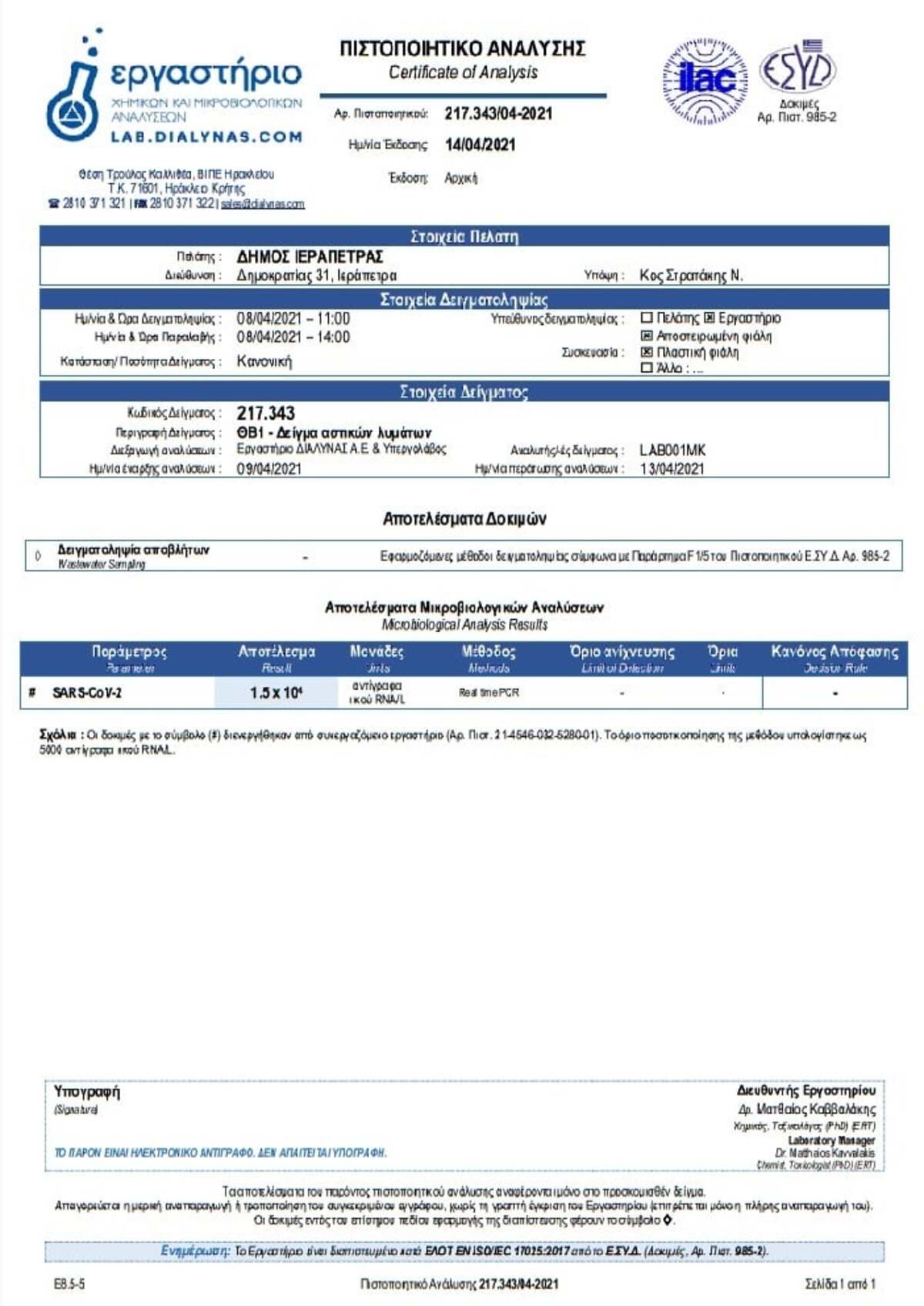 Τα αποτελέσματα από το δείγμα λυμάτων στην Ιεράπετρα που έγιναν στις 09/04/21 έδειξαν ότι ανιχνεύθηκε SARS-Co V-2 στα λύματα, το ιικό φορτίο είναι αυξημένο σε σχέση με τις προηγούμενες αναλύσεις.