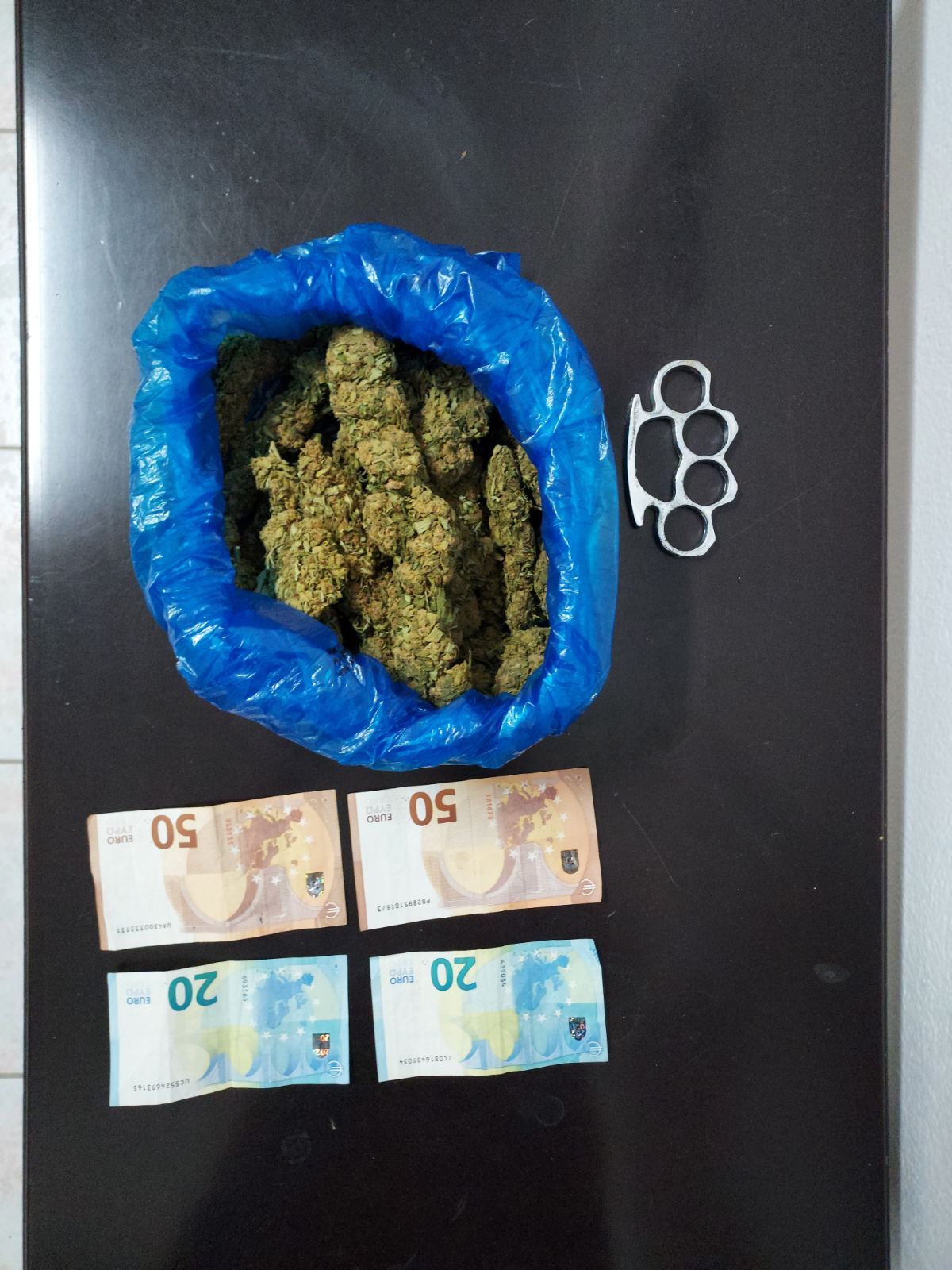 Κατά τη διάρκεια του ελέγχου βρέθηκαν και κατασχέθηκαν 220 γραμμάρια κάνναβης, σιδερογροθιά και το χρηματικό ποσό των 140 ευρώ.