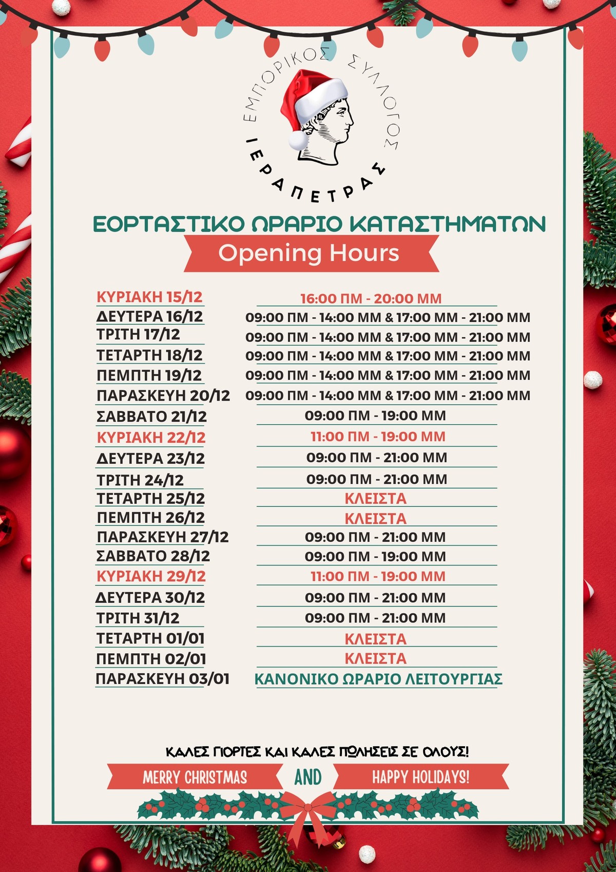 Ιεράπετρα: Το εορταστικό ωράριο των καταστημάτων ΛΑΣΙΘΙ ΙΕΡΑΠΕΤΡΑ 12:51 μ.μ. - Πέμπτη 5 Δεκεμβρίου 2024 12:12 μ.μ. - Πέμ, 05/51/2024 ΙΕΡΑΠΕΤΡΑ, ΕΟΡΤΑΣΤΙΚΟ ΩΡΑΡΙΟ ΚΑΤΑΣΤΗΜΑΤΩΝ, ΕΜΠΟΡΙΚΟΣ ΣΥΛΛΟΓΟΣ ΙΕΡΑΠΕΤΡΑΣ Η ανακοίνωση του Εμπορικού Συλλόγου Ιεράπετρας