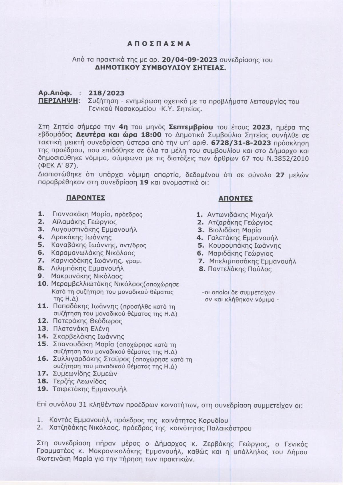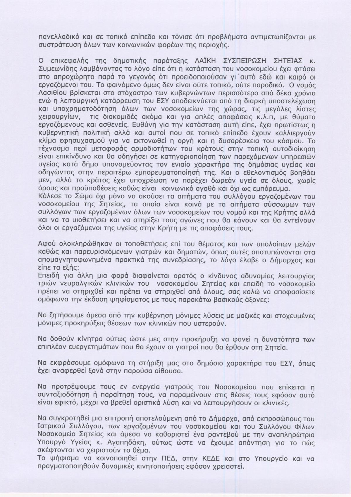 Ζητά την λήψη μέτρων για την εύρυθμη λειτουργία του Νοσοκομείου Σητείας, σύμφωνα με το Ψήφισμα του Δημοτικού Συμβουλίου, απευθυνόμενοι στους Υπουργούς Υγείας κ. Χρυσοχοΐδη και κα. Αγαπηδάκη, συγκεκριμένα επισημαίνεται ο κίνδυνος αδυναμίας λειτουργίας νευραλγικών κλινικών του Νοσοκομείου, λόγω συνταξιοδότησης και παραιτήσεων γιατρών και λόγω ελλείψεων σε μόνιμο προσωπικό όλων των ειδικοτήτων και ζητείται από την Κυβέρνηση να προκηρύξει άμεσα την πλήρωση των κενών θέσεων ιατρικού προσωπικού όλων των ειδικοτήτων, καθώς και λοιπού προσωπικού. Επίσης ζητείται η επαναφορά της διοικητικής αυτοτέλειας του Νοσοκομείου Σητείας, καθώς και η παροχή οικονομικών και επαγγελματικών κίνητρων στους γιατρούς ,που υπηρετούν σε άγονες και προβληματικές περιοχές.