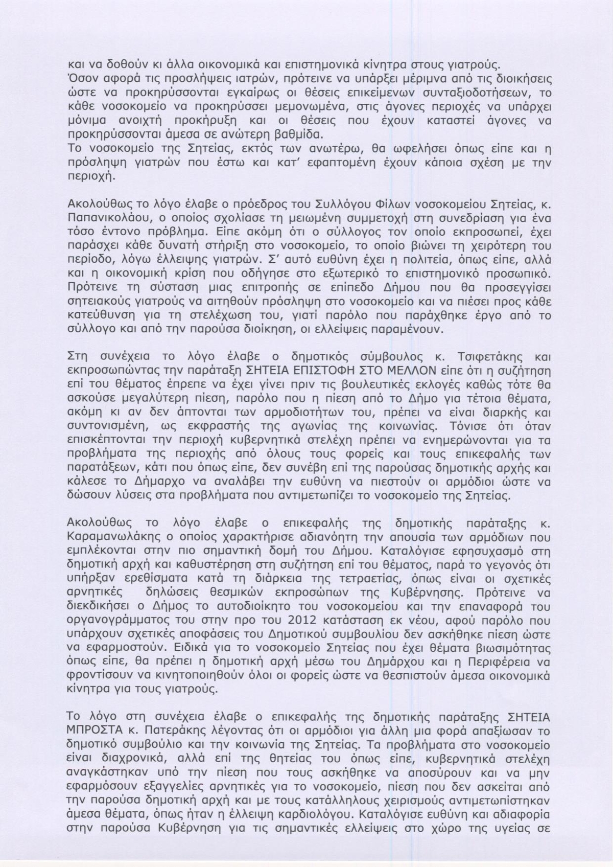 Θα θέλαμε, τις σκέψεις μας αυτές, εκ του σύνεγγυς να τις μοιραστούμε μαζί σας με ειλικρινή διάλογο και αλληλοκατανόηση. Γνωρίζουμε τον φόρτο εργασίας και την πολυτιμότητα του χρόνου σας, αλλά για την περιοχή μας, το πρόβλημα του Νοσοκομείου αποτελεί κρίσιμη ίσως και μοναδική προτεραιότητα που επείγει να επιλυθεί.
