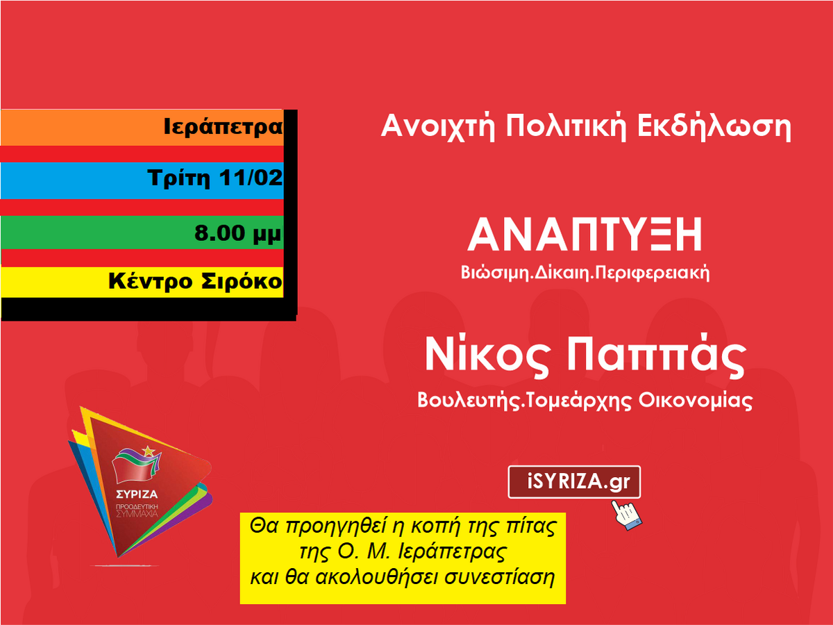 Την Τρίτη 11 Φεβρουαρίου 2020, ο Τομεάρχης Ανάπτυξης του ΣΥΡΙΖΑ Βουλευτής Νίκος Παππάς, στα πλαίσια περιοδείας στην Ανατολική Κρήτη, θα επισκεφθεί το νομό Λασιθίου και θα έχει επαφές με επαγγελματικούς φορείς και θα μιλήσει σε ανοιχτή πολιτική συγκέντρωση στην Ιεράπετρα.