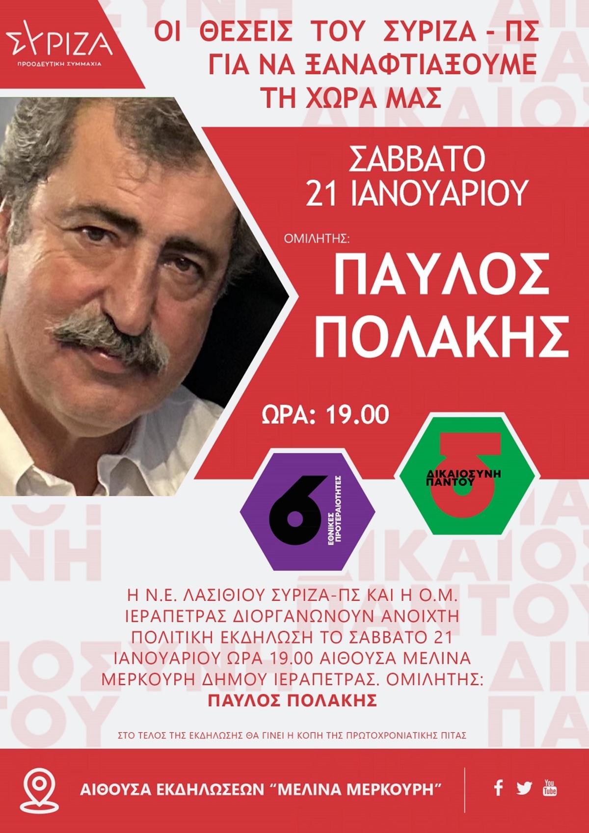 Ο πρώην Αναπληρωτής Υπουργός Υγείας, Βουλευτής Χανίων και νυν Τομεάρχης του τμήματος Διαφάνειας του ΣΥΡΙΖΑ-ΠΣ Παύλος Πολάκης θα μιλήσει σε ανοικτή Πολιτική Εκδήλωση το Σάββατο 21-01-2023 και ώρα 19:15 στην Αίθουσα Μελίνα Μερκούρη και θα αναλύσει τις 6 Εθνικές Προτεραιότητες και τις θέσεις του κόμματος ΣΥΡΙΖΑ-ΠΣ.