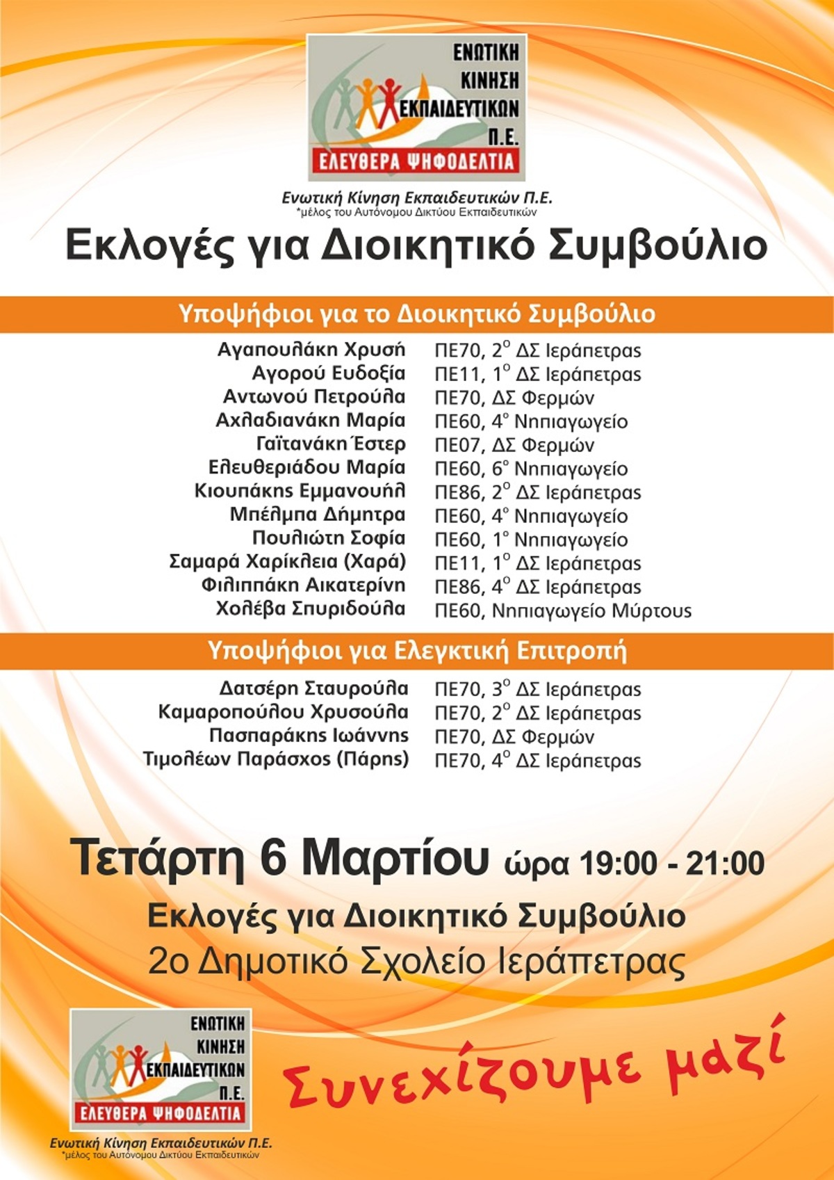 Η Ενωτική Κίνηση Εκπαιδευτικών Π.Ε.-Μέλος του Αυτόνομου Δικτύου καλεί σε μαζική συμμετοχή τις/τους συναδέλφισσες/συναδέλφους στις εκλογές. Να δώσουμε ΟΛΟΙ ΜΑΖΙ, ανεξαρτήτως συνδικαλιστικής προσέγγισης, ένα σαφές και ηχηρό μήνυμα-απάντηση στην πολιτική ηγεσία του ΥΠΑΙΘ και συνολικά στην κυβέρνηση που καταργεί δημοκρατικά δικαιώματα και περιορίζει τη συνδικαλιστική δράση: Είμαστε ΕΝΩΜΕΝΟΙ δίπλα στα Σωματεία μας για να διεκδικούμε, να προτείνουμε και να παλεύουμε για το Δημόσιο Σχολείο και τον Εκπαιδευτικό.