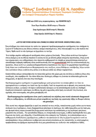 "ΤΑΛΩΣ" ΣΥΝΔΙΚΑΤΟ ΕΤΞ-ΣΕ Ν. ΛΑΣΙΘΙΟΥ