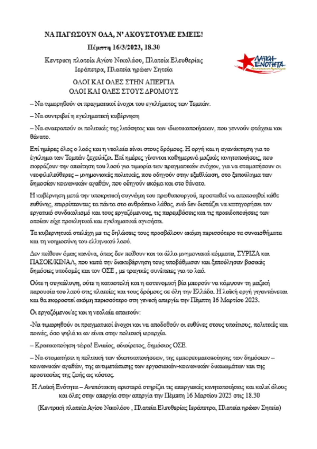 στην ΑΠΕΡΓΙΑΚΗ ΣΥΓΚΕΝΤΡΩΣΗ ΣΤΙΣ 16.3.23 στην Κεντρική Πλατεία της Σητείας