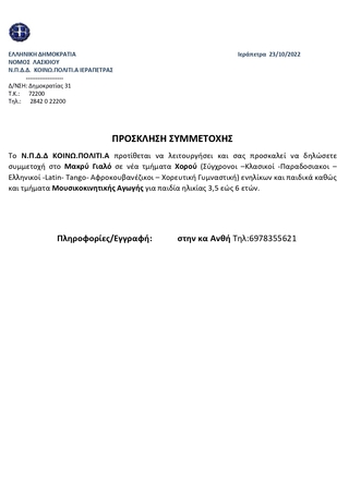 ΚΟΙΝΩ.ΠΟΛΙΤΙ.Α: Λειτουργία τμημάτων φωτογραφίας στην Ιεράπετρα και χορού στο Μακρύ Γιαλό ΙΕΡΑΠΕΤΡΑ 1:37 μ.μ. - Πέμπτη, 26 Οκτωβρίου 2023 01:10 μ.μ. - Πέμ, 26/37/2023 ΚΟΙΝΩ.ΠΟΛΙΤΙ.Α., ΧΟΡΟΣ, ΦΩΤΟΓΡΑΦΙΑΣ, ΜΑΘΗΜΑΤΑ Δείτε αναλυτικά :
