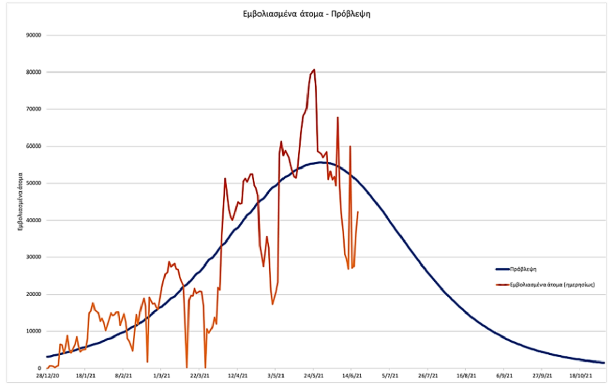 Το παρακάτω διάγραμμα παρουσιάζει τον αριθμό του πληθυσμού που έχουν εμβολιαστεί στην χώρα μας με μία δόση και προβλέπει τον αριθμό που θα εμβολιαστούν. Η κόκκινη γραμμή δείχνει τους ημερήσιους εμβολιασμούς από την εκκίνηση τους, από το τέλος Δεκέμβρη του 2020 μέχρι την 20/6/21. Η μπλε καμπανοειδή καμπύλη απεικονίζει την πρόβλεψη της εξέλιξης των εμβολιασμών με βάση τον πληθυσμό που θα εμβολιάζεται ημερησίως με μια δόση.