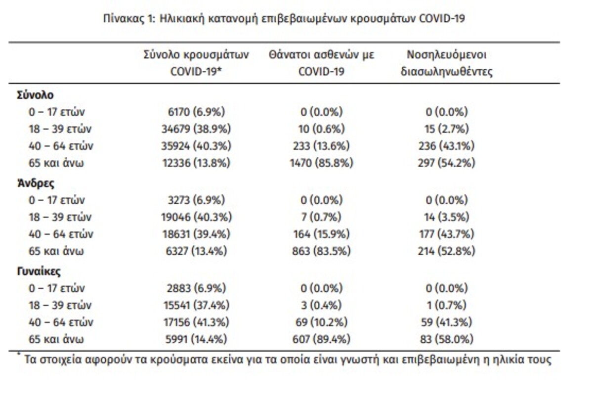 Η μέση ηλικία των κρουσμάτων είναι 42 έτη (εύρος 0 έως 104 ετών), ενώ η μέση ηλικία των θανάτων είναι 80 έτη (εύρος 25 έως 103 ετών). Η ηλικιακή κατανομή των (α) συνολικών κρουσμάτων, (β) των περιστατικών που κατέληξαν σε θάνατο και (γ) των ασθενών που νοσηλεύονται διασωληνωμένοι, είναι η ακόλουθη: