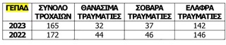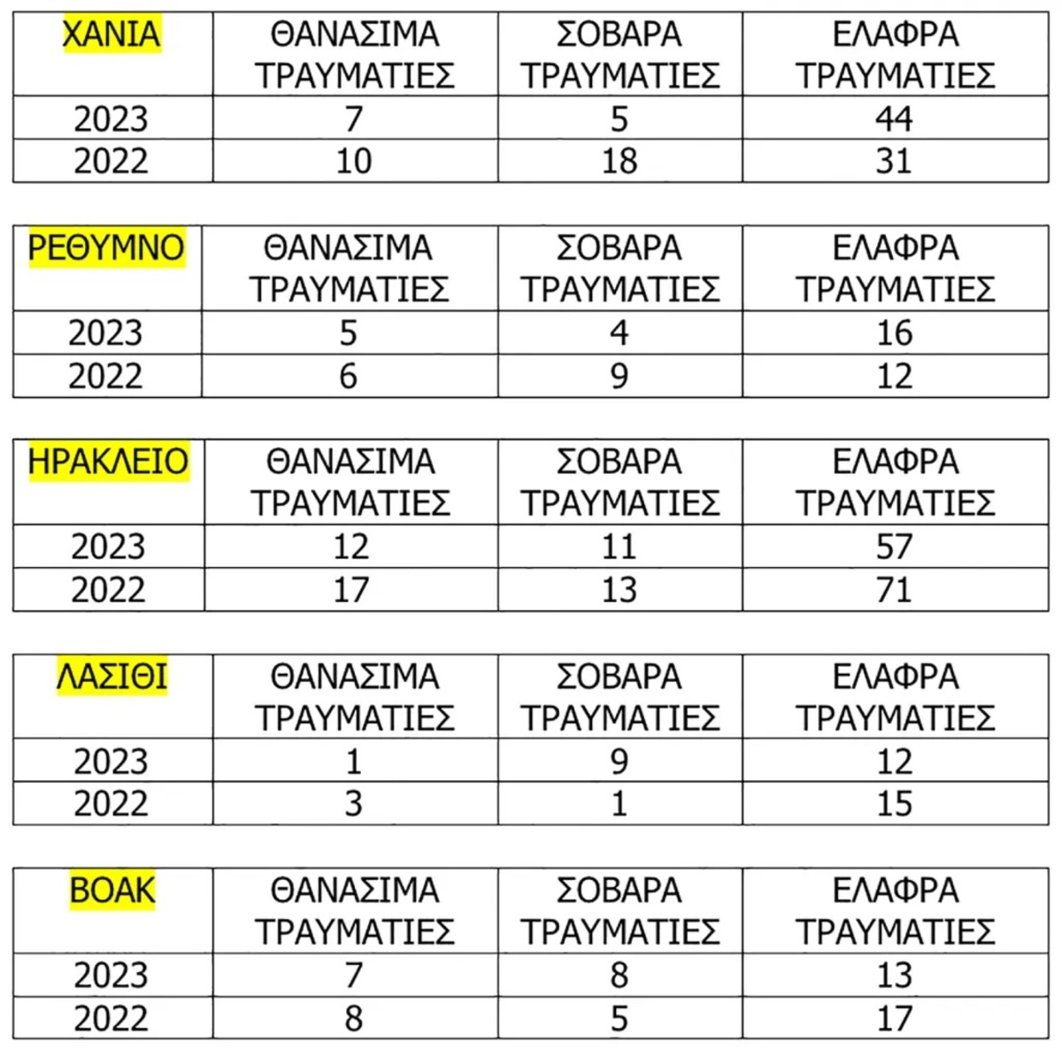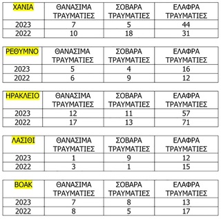 Σύμφωνα με τα τηρούμενα στοιχεία των Υπηρεσιών Τροχαίας κατά το έτος 2023, σε επίπεδο Κρήτης σημειώθηκαν συνολικά 165 τροχαία ατυχήματα -δυστυχήματα με 32 θανάσιμους τραυματισμούς, 37 σοβαρούς τραυματισμούς και 142 ελαφρούς τραυματισμούς.