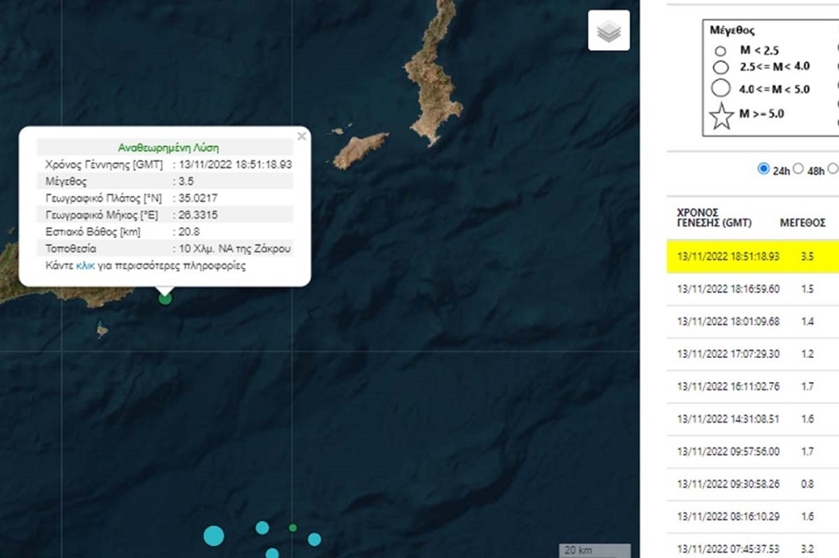 Σεισμός 3,5 βαθμών της κλίμακας Ρίχτερ σημειώθηκε αργά το βράδυ της Κυριακής στο θαλάσσιο χώρο νότια της Κρήτη.