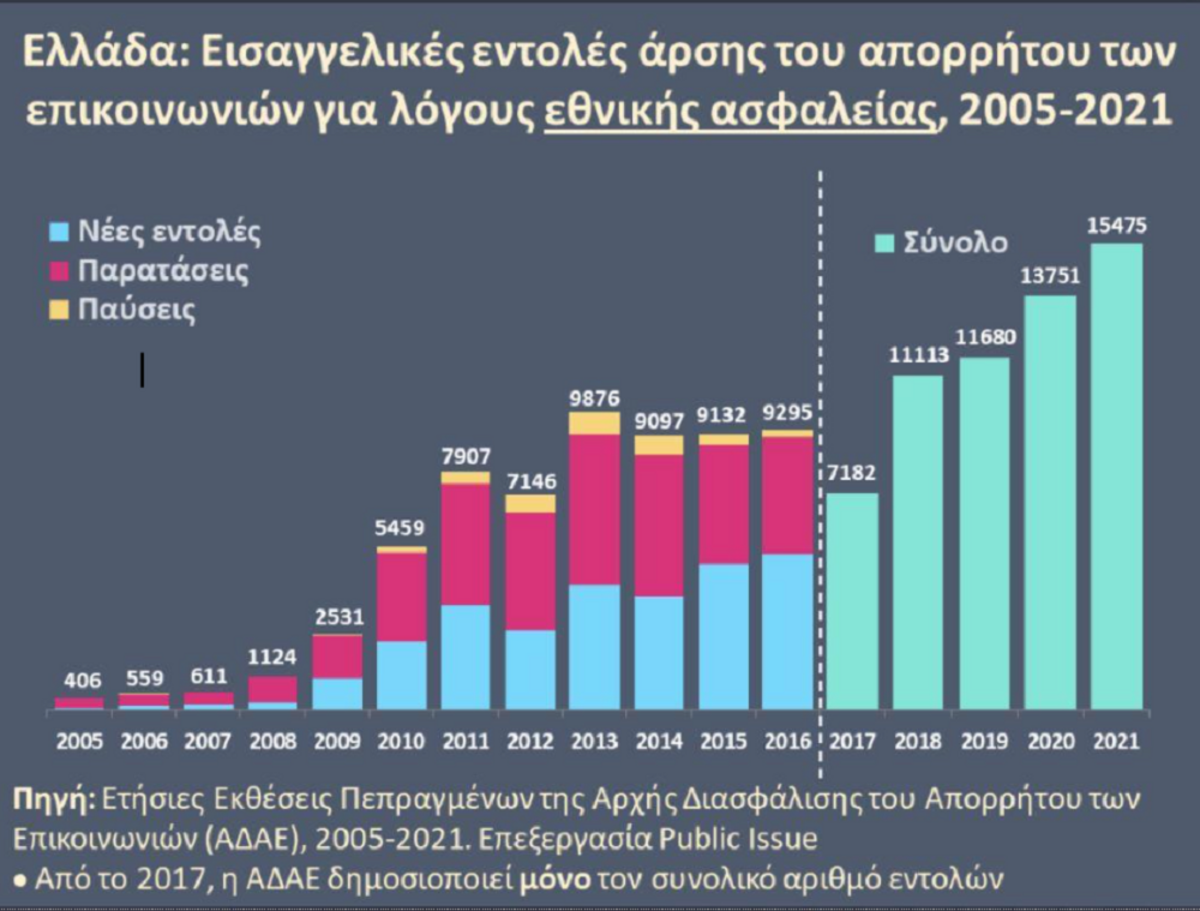 Σύμφωνα με πίνακα της Α.Δ.Α.Ε. που έχει δημοσιοποιηθεί πρόσφατα, αυτές, οι εισαγγελικές εντολές για παρακολουθήσεις και παρατάσεις παρακολουθήσεων συνδιαλέξεων για λόγους εθνικής ασφάλειας, έχοντας μια συνεχή ανοδική πορεία από το έτος 2015 και μετά, έχουν ξεπεράσει τις 15.000 ετησίως το έτος 2021.