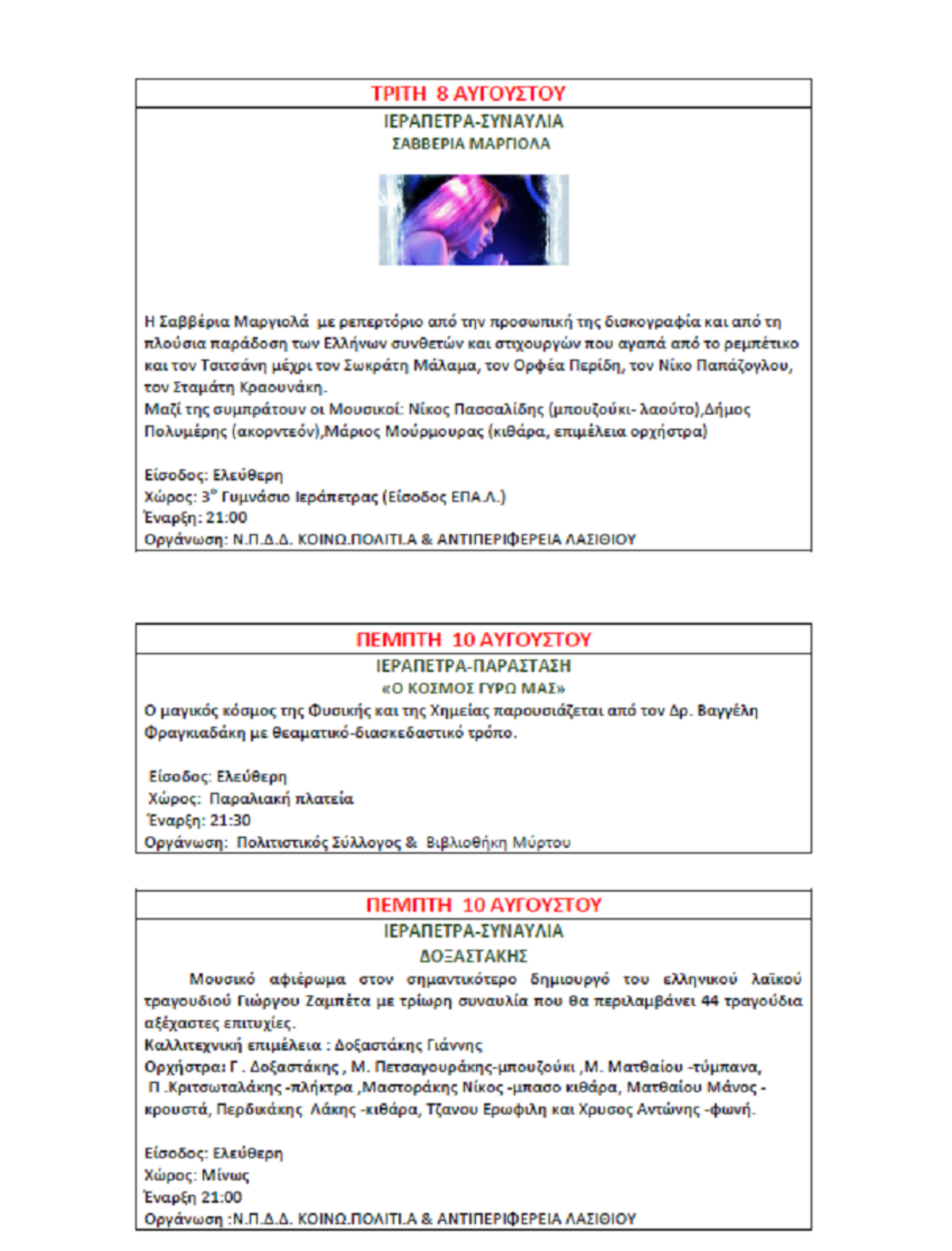 ΚΥΡΒΕΙΑ 2023 –Ιεράπετρα: Έναρξη με μια εκπληκτική συναυλία με Δήμο Αναστασιάδη ΛΑΣΙΘΙ ΙΕΡΑΠΕΤΡΑ 1:01 μ.μ. - Τρίτη, 27 Ιουνίου 2023 01:06 μ.μ. - Τρί, 27/01/2023 ΔΗΜΟΣ ΙΕΡΑΠΕΤΡΑΣ, ΠΡΟΓΡΑΜΜΑ, ΚΥΡΒΕΙΑ 2023 Το Σάββατο 1η Ιουλίου στην πλατεία Ιεράπετρας – Αναλυτικά το πρόγραμμα των εκδηλώσεων