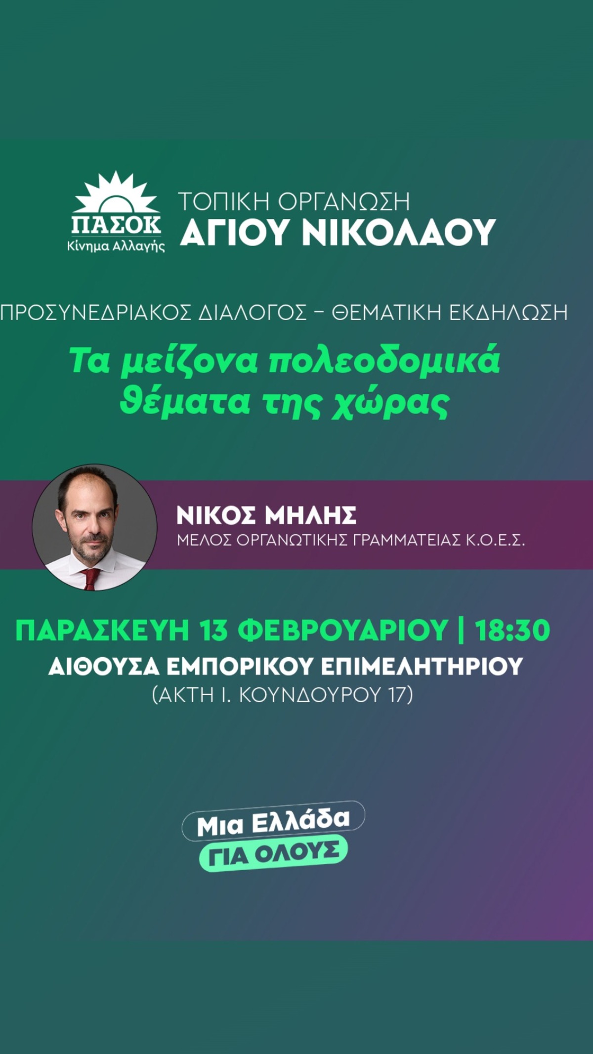 Εκδήλωση με θέμα «Τα μείζονα πολεοδομικά θέματα της χώρας» διοργανώνει την Παρασκευή 13 Φεβρουαρίου, η  Τοπική Οργάνωση ΠΑΣΟΚ – Κίνημα Αλλαγής Αγίου Νικολάου, στα πλαίσια του προσυνεδριακού διαλόγου του κόμματος.
