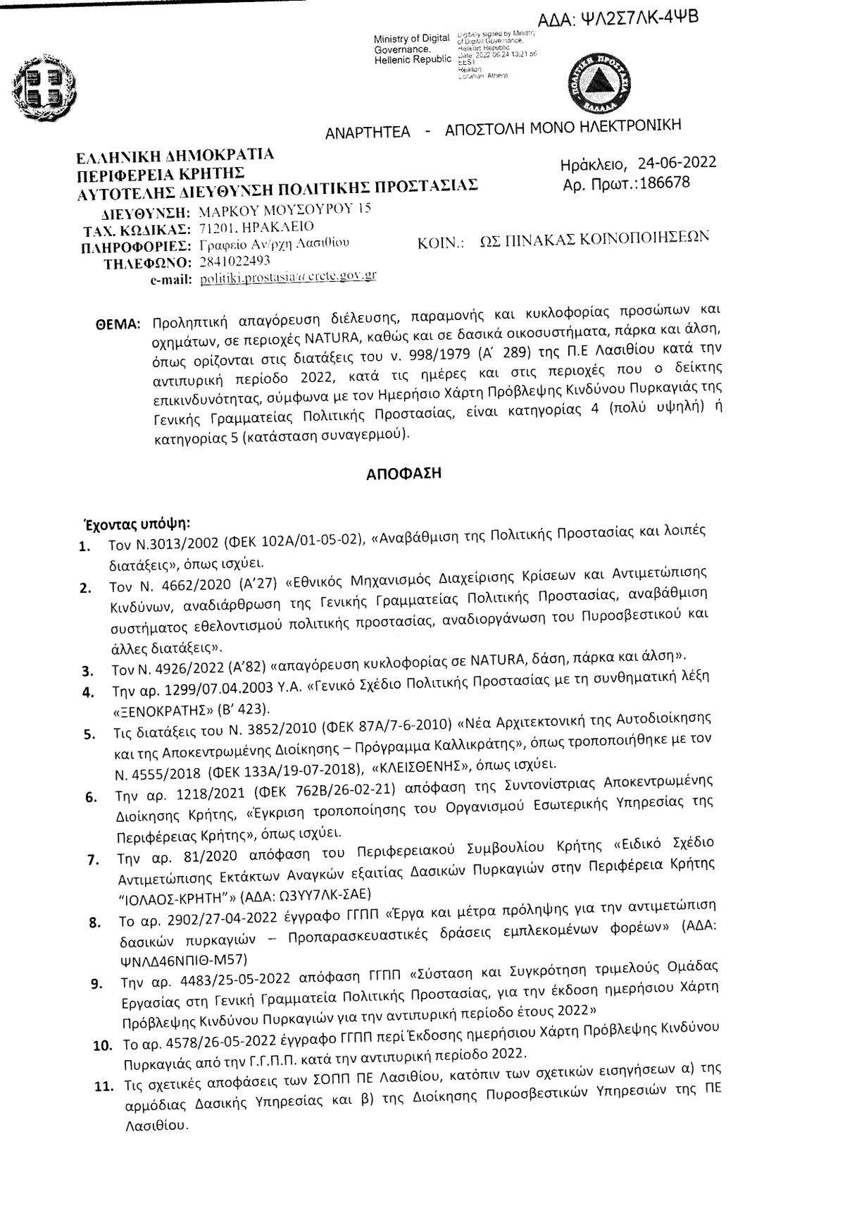 Λασίθι: ''Κλείνουν'' οι περιοχές Natura τις ημέρες υψηλής επικινδυνότητας για πυρκαγιά ΛΑΣΙΘΙ ΙΕΡΑΠΕΤΡΑ 1:03 μ.μ. - Τετάρτη 29 Ιουνίου 2022 01:06 μ.μ. - Τετ, 29/03/2022 ΛΑΣΙΘΙ, NATURA Η απόφαση του αντιπεριφερειάρχη Γιάννη Ανδρουλάκη