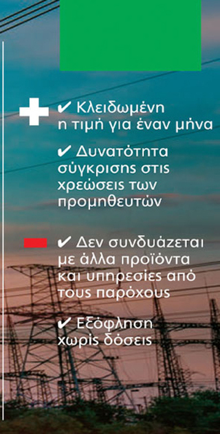 Το μειονέκτημα είναι ότι επειδή αυτό είναι το πιο σταθερό, ουσιαστικά, πρόγραμμα, θα είναι και το πιο... ξερό. Δεν θα υπάρχει, δηλαδή, προμηθευτής -λογικά- που θα προσθέσει προωθητικές ενέργειες στο τιμολόγιο το οποίο θα είναι και το πιο δημοφιλές (σκεφτείτε πόσοι καταναλωτές θα μεταφερθούν αυτόματα σε αυτό, για παράδειγμα). Οπότε ξεχάστε συνδυασμούς με άλλα προϊόντα και υπηρεσίες και, το κυριότερο, είναι πιθανό οι περισσότεροι προμηθευτές να παρέχουν το συγκεκριμένο τιμολόγιο χωρίς τη δυνατότητα εξόφλησης του λογαριασμού σε δόσεις.