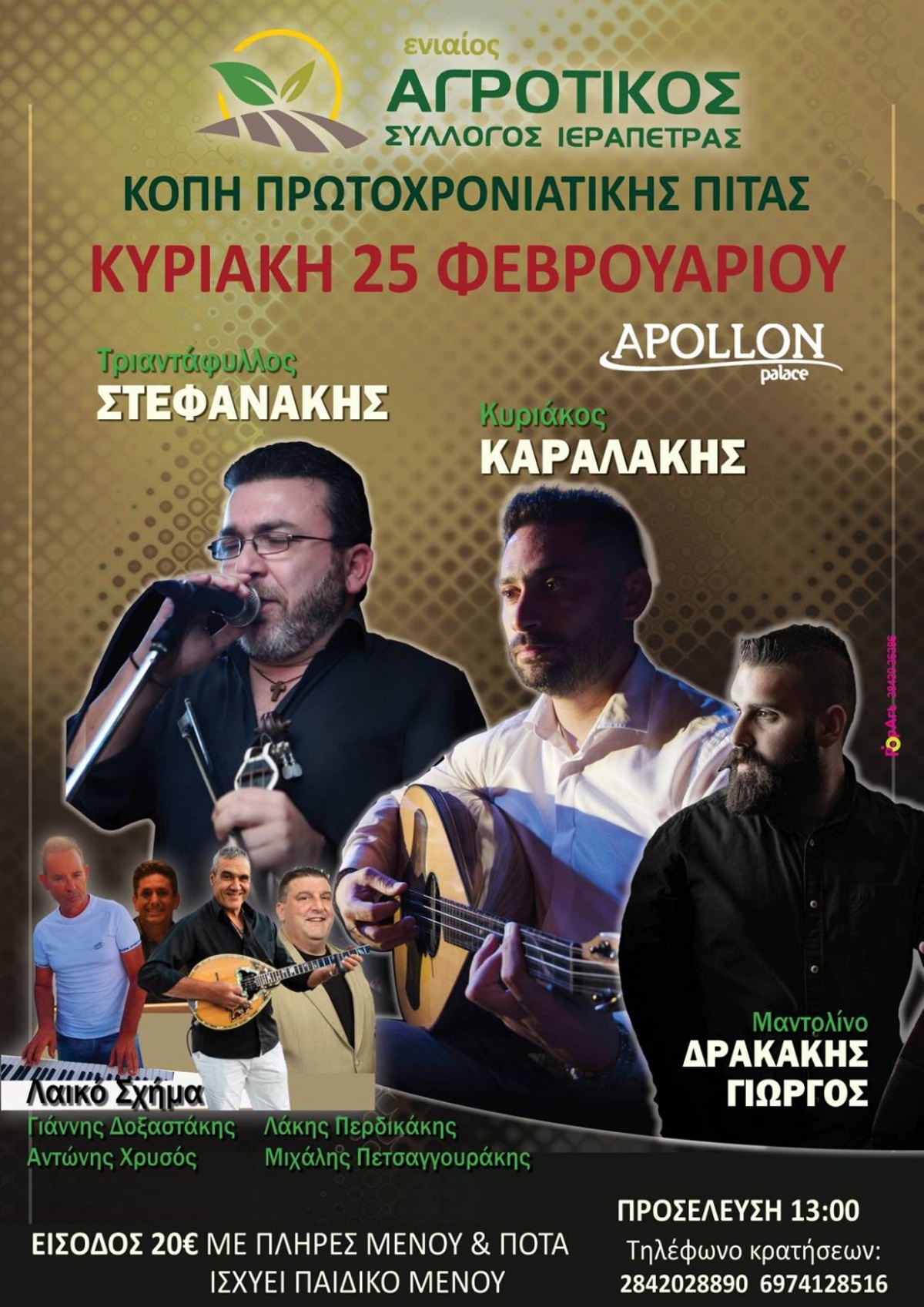 Ο Ενιαίος Αγροτικός Σύλλογος Ιεράπετρας διοργανώνει ημερήσια εκδήλωση για Κοπή Πρωτοχρονιάτικης Πίτας, την Κυριακή 25 Φεβρουαρίου 2024 στην αίθουσα δεξιώσεων Apollon Palace, με ώρα προσέλευσης 13:00 – μεσημέρι.