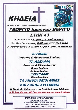Ολόκληρη η κοινωνία της Ιεράπετρας πενθεί για τον αδόκητο χαμό του 43χρονου με καταγωγή από το χωριό των Μεσσελέρων, που είχε από τα εφηβικά του χρόνια μεγάλη αγάπη για τις μηχανές.