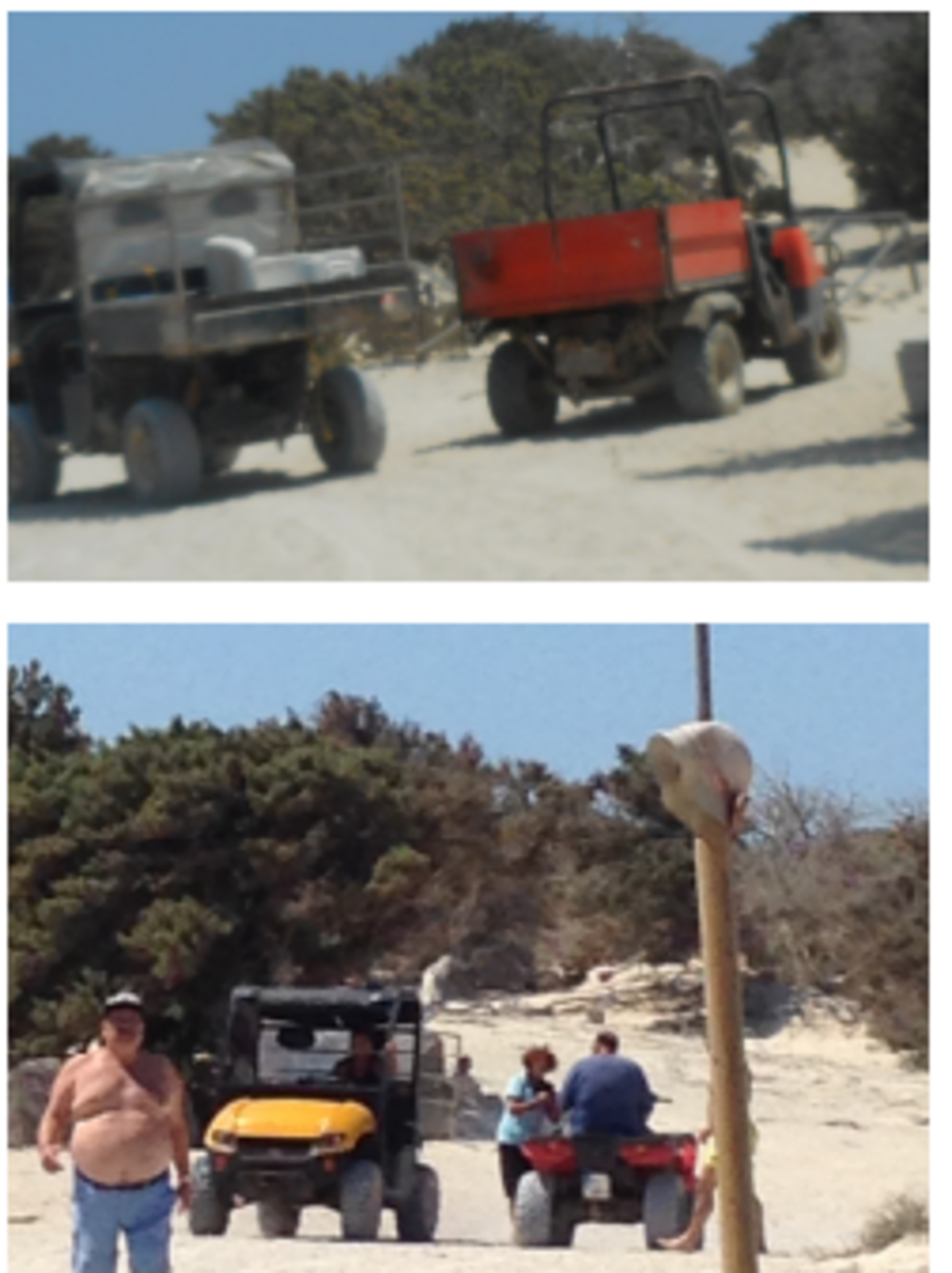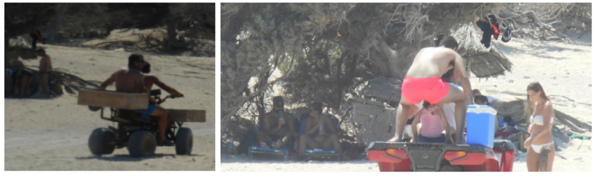 • κατεγράφησαν 2015-2019, 5-6 μεγάλου κυβισμού 4τροχες θορυβώδεις μοτοσικλέτες (γουρούνες) που μεταφέρουν διαρκώς παράνομο αφορολόγητο πετρέλαιο σε πλαστικά δοχεία για τις γεννήτριες, έχουν διαμορφώσει δρόμους ανάμεσα στις προστατευόμενες αμμοθίνες με αποτέλεσμα την εκρίζωση των δύο ειδών άρκευθου ((Juniperus spp υπεραιωνόβιοι κέδροι) , ΑΛΛΑ οι Δημόσιες Υπηρεσίες (Αστυνομικό Τμήμα Ιεράπετρας κ Διεύθυνση Δασών Αγ.Νικολάου) δεν προέβησαν ως όφειλαν και στην κατάσχεση, απομάκρυνση των και την επιβολή διοικητικών προστίμων.