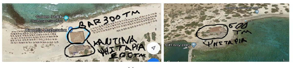Όλα τα παράνομα παραπήγματα (πέργκολες, μπάρ, αποθήκες, σπίτι, κοντέινερ, ψησταριές, ομπρέλες, τέντες, ντεπόζιτα, γεννήτριες, μοτοσικλέτες, ψυκτικοί χώροι, ντουζιέρες, κ.α.)συνεχίζουν και υφίστανται εδώ και 15 χρόνια, αν και : • έχουν μετρηθεί και καταγραφεί 300 τμ BAR στην Βόρεια παραλία Πελεγκρίνα αντί των 15 τμ του διαγωνισμού, 200 τμ στην Βόρεια παραλία Πελεγκρίνα (λειτουργεί ως ψησταριά ΧΩΡΙΣ ΑΔΕΙΑ , είναι τελείως παράνομο αφού δεν δημοπρατήθηκε ΠΟΤΕ στην Διαύγεια), και 600 τμ στην Νότια παραλία Βουγιού Μάτι αντί των 15 τμ που προέβλεπε ο διαγωνισμός και είχε ενυπογράφως συμφωνήσει ο μισθωτής (φωτό κατωτέρω) • έχουν εκδοθεί πρωτόκολλα κατεδάφισης • συνεπακόλουθα πιστεύω (;) , θα έχουν εκδοθεί αποφάσεις για απομάκρυνση των, • ίσως (;) έχουν εκδοθεί και κάποια μικρά προστίματα –μία φορά πιστεύω και αυτό για τα μάτια του κόσμου- , αντί του ορθού που θα έπρεπε ΚΑΘΕ ΧΡΟΝΟ ΠΡΟΣΤΙΜΟ, μέχρι οι παραβάτες ………….., και οι λοιποί παρένθετοι να ευαρεστηθούν να τα απομακρύνουν μερίμνης και εξόδοις των- σίγουρα δεν έχουν εισπραχθεί τα καταλογισθέντα, και οι παράνομες αυτές κατασκευές συνεχίζουν και υφίστανται, και τις εκμεταλλεύονται οι εκάστοτε επιτήδειοι με όποιο όνομα και αν είναι ο τελικός πλειοδότης του διαγωνισμού (υιού, κόρης, υπαλλήλου, φίλου, άγνωστου), με την ανοχή και …την σιωπή των δημόσιων υπηρεσιών, αφού γνωρίζουν ….. και που όλα αυτά δυστυχώς με την αδιαφορία, την αδράνεια, την αναβλητικότητα, τον ωχαδελφισμό, την οκνηρία, το άλλοθι της αλληλοεπικάλυψης και συναρμοδιότητας Δημόσιων Υπηρεσιών, συμβάλλουν αρνητικά στην περιβαλλοντική κατάσταση της Νήσου Χρυσής, και τον γενικότερο διασυρμό της πατρίδας μας στα μάτια χιλιάδων επισκεπτών.