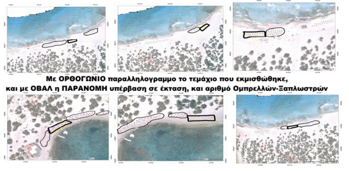 Με ΟΡΘΟΓΩΝΙΟ παραλληλογραµµο το τεµάχιο που εκµισθώθηκε, και µε ΟΒΑΛ η ΠΑΡΑΝΟΜΗ υπέρβαση σε έκταση, και αριθµό Οµπρελλών-Ξαπλωστρών