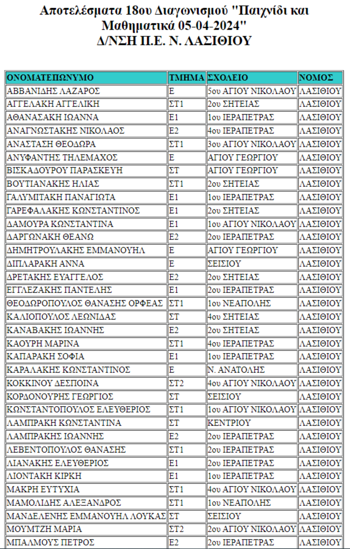 Oι επιτυχόντες του 18ου Διαγωνισμού ΄΄Μικρός Ευκλείδης΄΄για το Λασίθι ΛΑΣΙΘΙ ΙΕΡΑΠΕΤΡΑ 3:23 μ.μ. - Πέμπτη 23 Μαΐου 2024 03:05 μ.μ. - Πέμ, 23/23/2024 ΕΠΙΤΥΧΙΕΣ , ΔΙΑΓΩΝΙΣΜΟΣ ΜΑΘΗΜΑΤΙΚΩΝ, ΜΑΘΗΜΑΤΙΚΗ ΕΤΑΙΡΙΑ Αναλυτικά τα ονόματα των επιτυχόντων