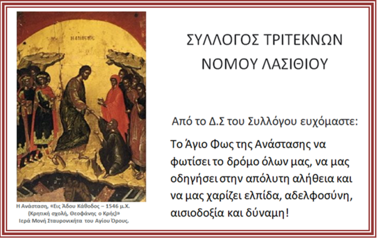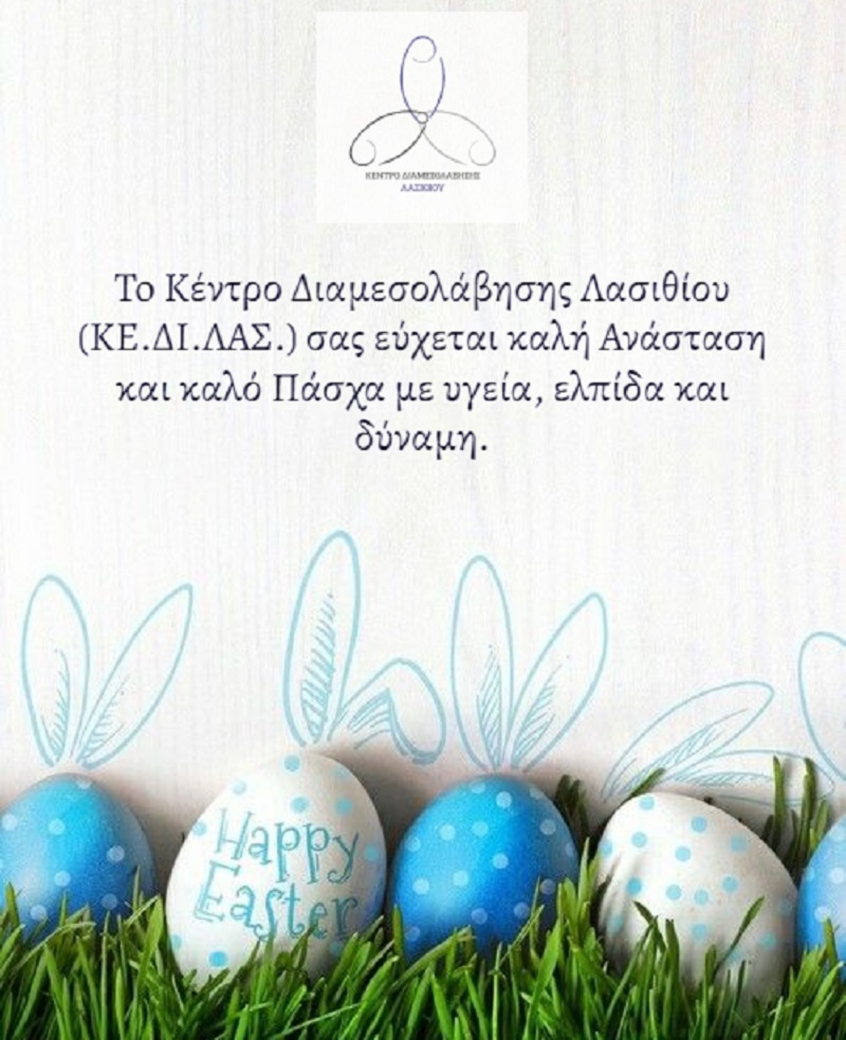 Για τις άγιες μέρες του Πάσχα θέλω να μεταφέρω τις θερμότερες ευχές μου για υγεία, ευτυχία ειρήνη και πρόοδο. Με ανθρωπιά ενότητα συνοχή και ελπίδα να συμπαρασταθούμε σε κάθε δοκιμαζόμενο συνάνθρωπο διδασκόμενοι από την ουσιαστική συνεχόμενη και αδαπάνητη Αγάπη του Θεανθρώπου στον κόσμο