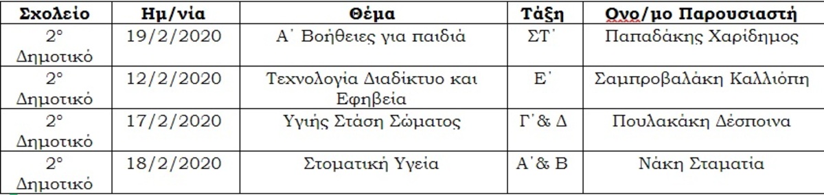 Η δ/ντρια, οι εκπαιδευτικοί και οι μαθητές του 2ου Δημοτικού Σχολείου Ιεράπετρας, αισθάνονται την ανάγκη να ευχαριστήσουν την κ. Μερεσεντόγλου Βαρβάρα Δ/ντρια Ν.Υ. Γ.Ν. - Κ.Υ. Ιεράπετρας καθώς και τους παρουσιαστές: τον κ. Παπαδάκη Χαρίδημο, την κ. Σαμπροβαλάκη Καλλιόπη, την κ. Πουλακάκη Δέσποινα, και την κ. Νάκη Σταματία για τα προγράμματα που πραγματοποιήθηκαν στο σχολείο μας.