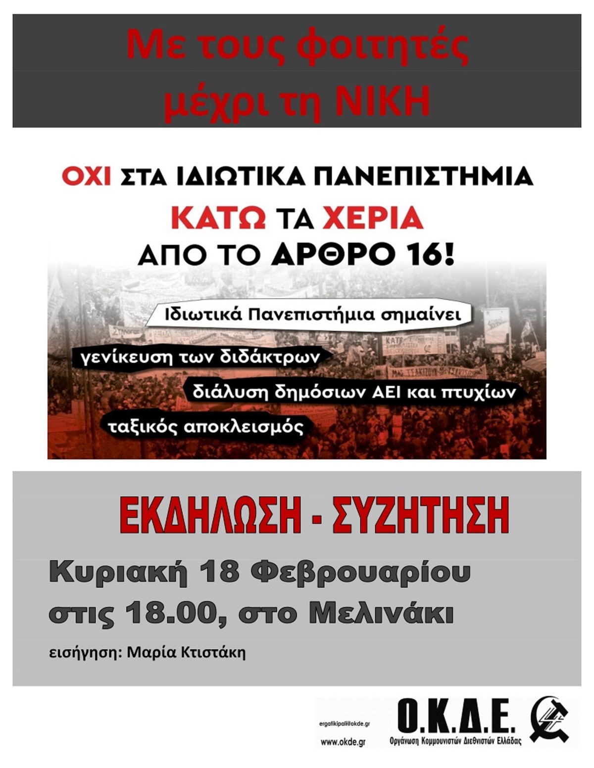 Η τεράστια πανελλαδική κινητοποίηση στην Αθήνα στις 8/2 ήταν ένα ηχηρό χαστούκι για τους Μητσοτάκη-Πιερρακάκη. Πάνω από 20.000 φοιτητές, μαθητές και εργαζόμενοι τσαλάκωσαν την εικόνα «επιτυχιών» του Μητσοτάκη. Φωνάξαν δυνατά: ΚΑΤΩ ΤΑ ΧΕΡΙΑ ΑΠΟ ΤΟ ΑΡΘΡΟ 16, ΟΧΙ ΣΤΑ ΙΔΙΩΤΙΚΑ ΠΑΝΕΠΙΣΤΗΜΙΑ! ΦΤΑΝΕΙ ΠΙΑ – ΔΕΝ ΕΙΜΑΣΤΕ ΟΥΤΕ ΠΕΛΑΤΕΣ ΟΥΤΕ ΔΟΥΛΟΙ! Η τρομοκρατία με ΜΑΤ και συλλήψεις (Νομική Κομοτηνής), οι τηλε-εξεταστικές και η άρον-άρον κατάθεση του νομοσχεδίου σε διαβούλευση, δεν έμειναν αναπάντητα, κλονίζοντας το επιχειρούμενο πραξικόπημα της κυβέρνησης, την αντισυνταγματική παράκαμψη-κατάργηση του Άρθρου 16.