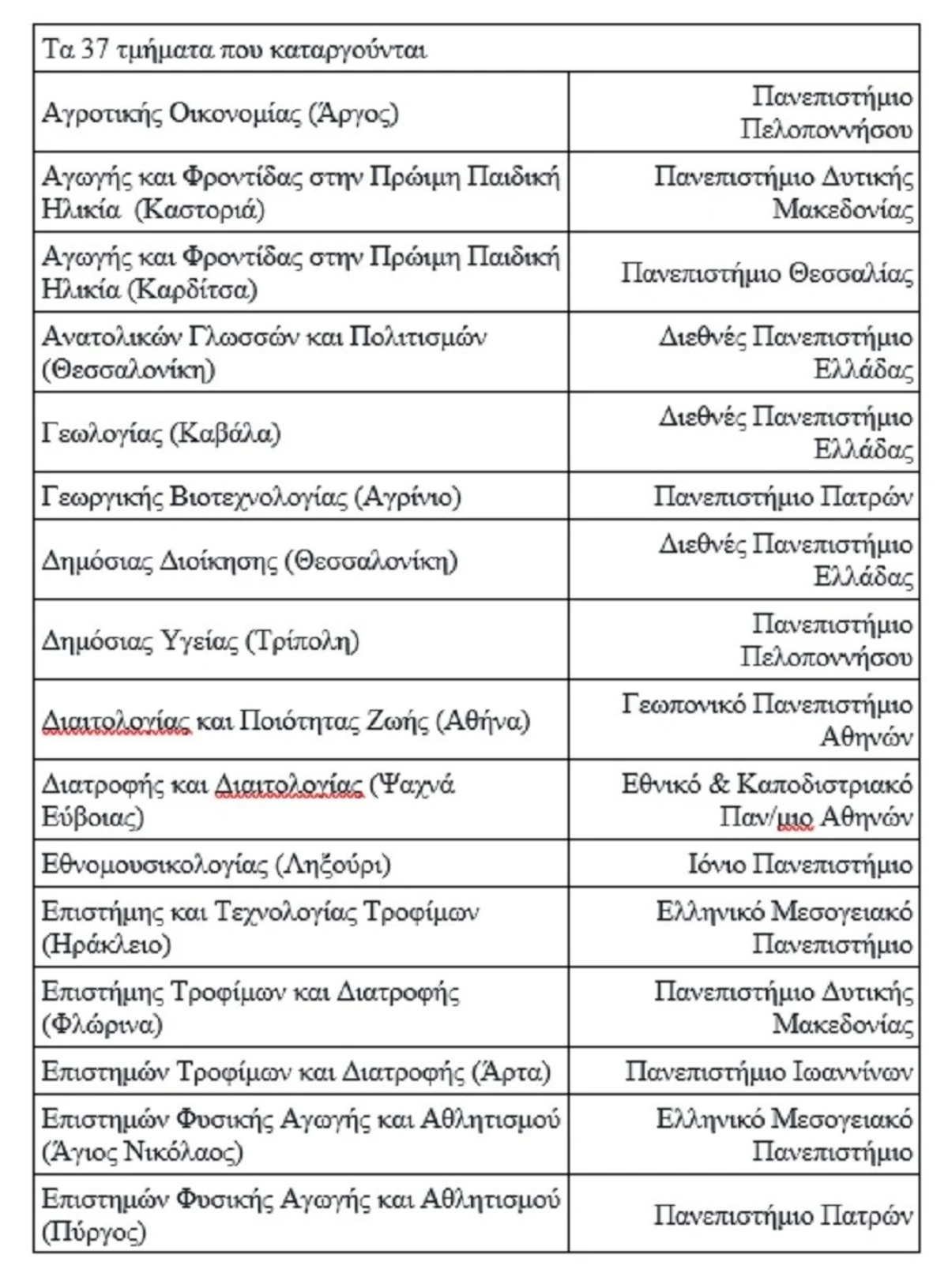 Με πρόταση από την Εθνική Αρχή Ανώτατης Εκπαίδευσης (ΕΘΑΑΕ) και την «υπογραφή» της κυβέρνησης φαίνεται ότι μπαίνει οριστικό τέλος στη λειτουργία 37 πανεπιστημιακών τμημάτων, που επρόκειτο να λειτουργήσουν σε Αθήνα , Θεσσαλονίκη και σχεδόν όλες τις μεγάλες πόλεις της χώρας.