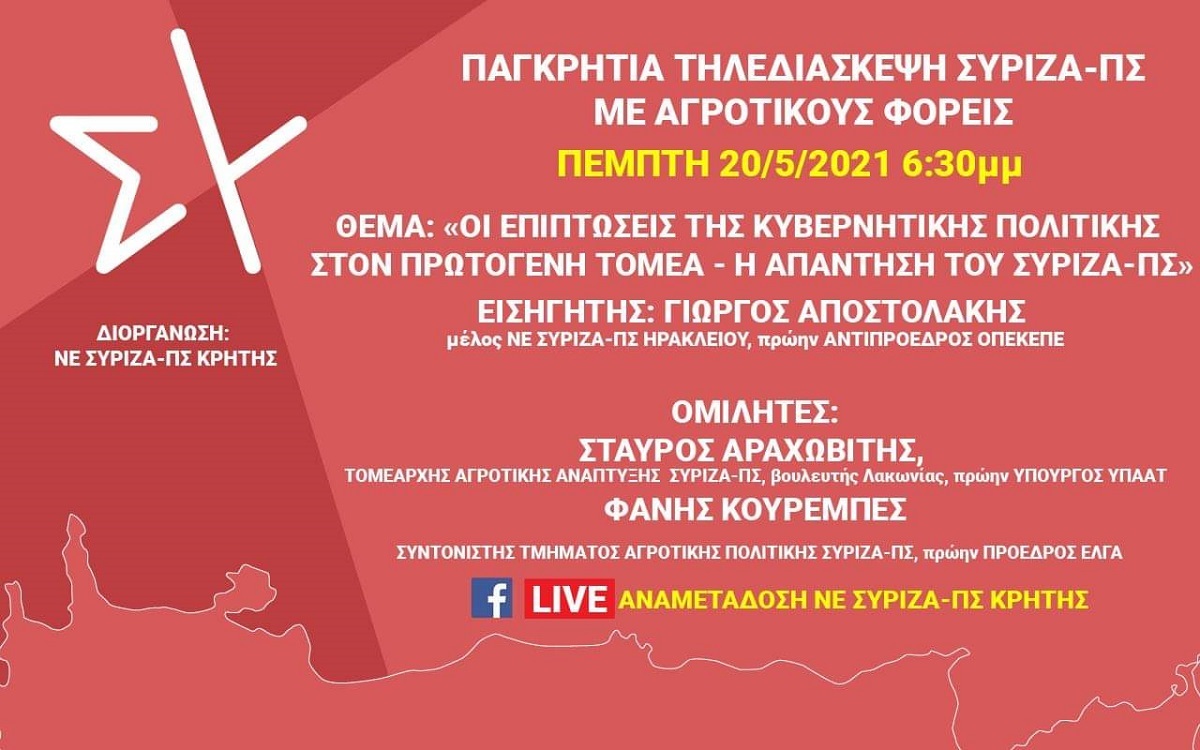 Παγκρήτια τηλεδιάσκεψη ΣΥΡΙΖΑ - ΠΣ με αγροτικούς φορείς σήμερα Πέμπτη στις 18:30 ΛΑΣΙΘΙ ΙΕΡΑΠΕΤΡΑ 2:13 μ.μ. - Πέμπτη 20 Μαΐου 2021 02:05 μ.μ. - Πέμ, 20/13/2021 ΚΡΗΤΗ, ΤΗΛΕΔΙΑΣΚΕΨΗ, ΣΥΡΙΖΑ ΠΣ, ΑΓΡΟΤΙΚΟΙ ΦΟΡΕΙΣ Θέμα: "Οι επιπτώσεις της κυβερνητικής πολιτικής στον Πρωτογενή Τομέα - Η απάντηση του ΣΥΡΙΖΑ - ΠΣ"