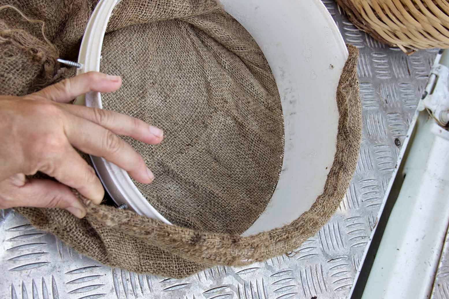 Μετά τεντώνουμε περιμετρικά από την αντίθετη πλευρά του κουβά μέχρι να αγκιστρώσουμε το σακί και από την άλλη βίδα