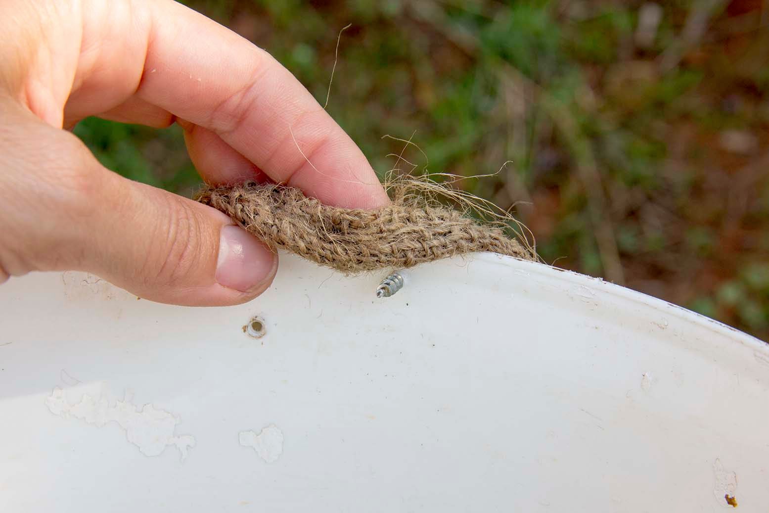και το τεντώνουμε περιμετρικά πάνω στον κομμένο κουβά μέχρι να φτάσουμε να το αγκιστρώσουμε στη μια από τις δυο βίδες που βάλαμε αρχικά.