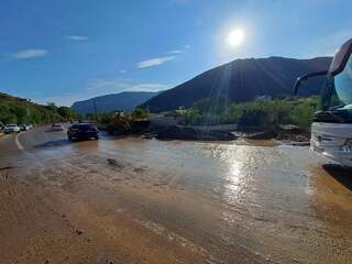 Zημιές σε υποδομές δεν διαπιστώθηκαν έως τώρα, ωστόσο, πλημμύρισε η μισή παραλία στην περιοχή. Επίσης, εκτός από τα αυτοκίνητα, παρασύρθηκαν κάδοι απορριμμάτων, ομπρέλες και ξαπλώστρες ενώ ζημιές, ευτυχώ μικρές προκλήθηκαν σε μία ταβέρνα.