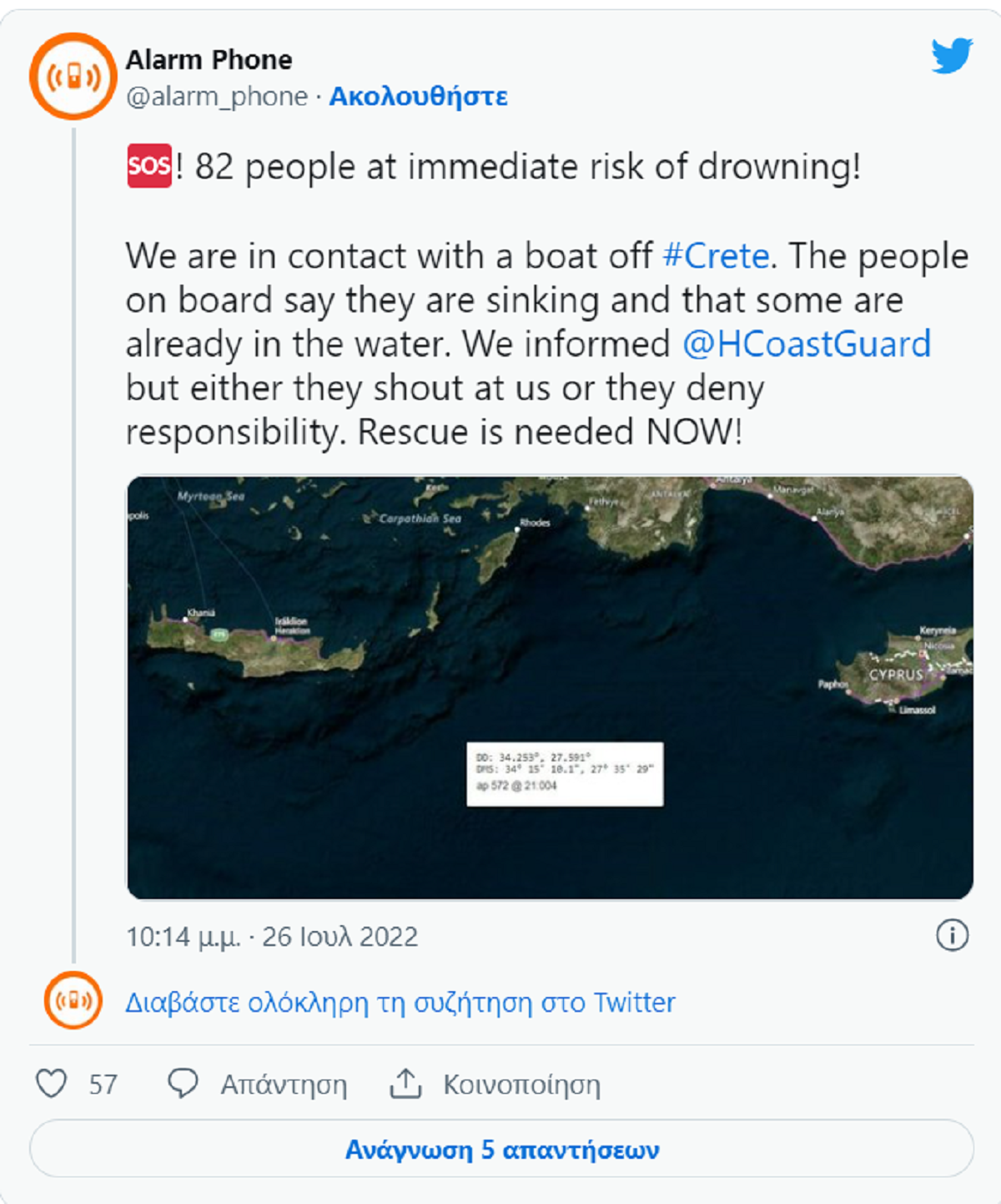 Στο σχετικό tweet αναφέρεται: «Ογδόντα δύο άνθρωποι διατρέχουν άμεσο κίνδυνο πνιγμού. Βρισκόμαστε σε επικοινωνία με μια βάρκα νότια της Κρήτης. Οι άνθρωποι στη βάρκα αναφέρουν πως βουλιάζουν ενώ μερικοί βρίσκονται ήδη στο νερό. Η ανάγκη διάσωσης είναι άμεση» καταλήγει η οργάνωση, ενώ κάνει λόγο για αδράνεια του Λιμενικού Σώματος.