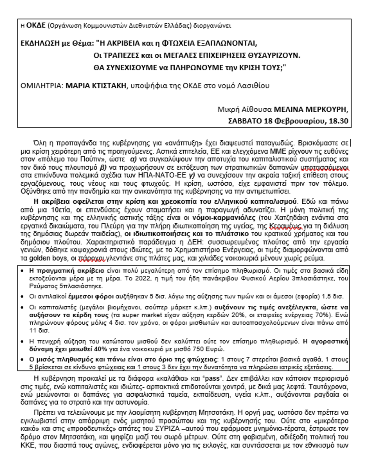 Πολιτική εκδήλωση της ΟΚΔΕ στην Ιεράπετρα ΕΝΟΤΗΤΕΣ ΠΟΛΙΤΙΚΗ 1:05 μ.μ. - Πέμπτη 16 Φεβρουαρίου 2023 01:02 μ.μ. - Πέμ, 16/05/2023 ΦΤΩΧΕΙΑ , ΑΚΡΙΒΕΙΑ, ΟΚΔΕ, ΠΟΛΙΤΙΚΗ ΣΥΓΚΕΝΤΡΩΣΗ, ΜΑΡΙΑ ΚΤΙΣΤΑΚΗ Ομιλήτρια: Μαρία Κτιστάκη, υποψήφια της ΟΚΔΕ στο νομό Λασιθίου