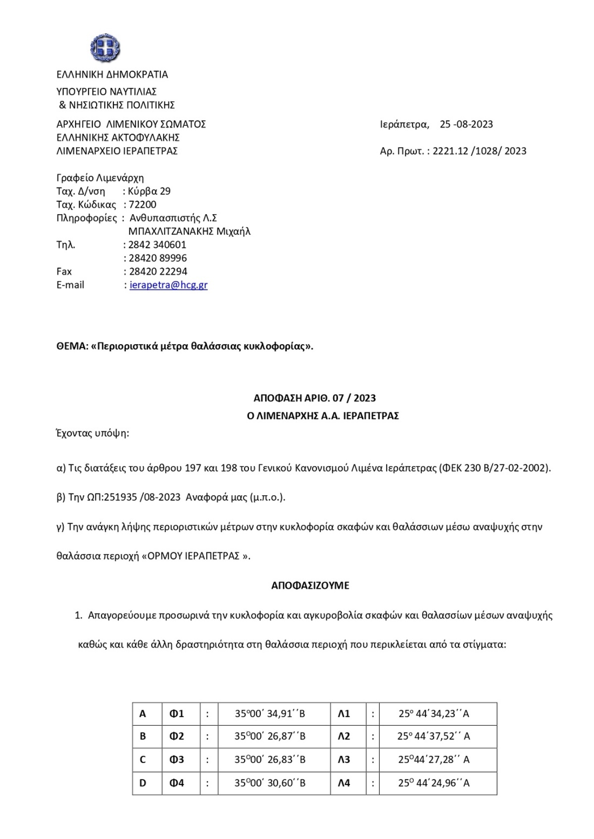 Αναλυτικά η ανακοίνωση του Λιμεναρχείου