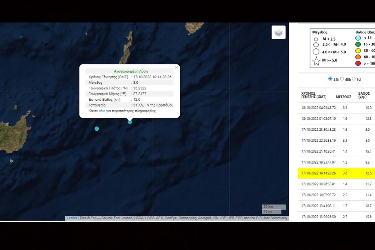 Σεισμική δόνηση 3,6 βαθμών της κλίμακας Ρίχτερ σημειώθηκε αργά το βράδυ της Δευτέρας 17 Οκτωβρίου, στο θαλάσσιο χώρο ανατολικά της Κρήτης και νότια της Καρπάθου.