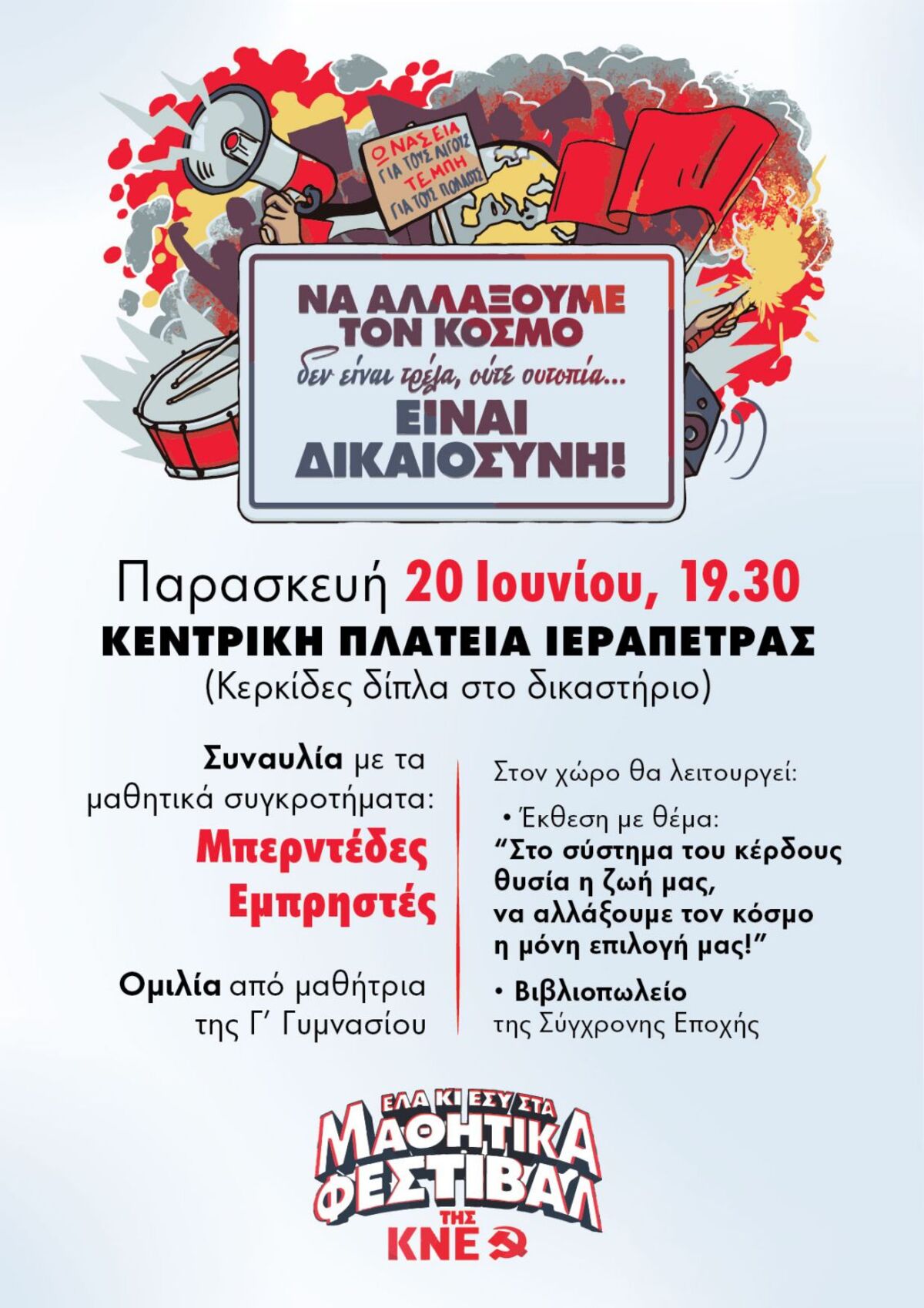 Παρασκευή και Σάββατο κορυφώνονται οι δραστηριότητες στα πλαίσια του μαθητικού φεστιβάλ της ΚΝΕ σε Ιεράπετρα και Άγιο Νικόλαο με σύνθημα «Να αλλάξουμε τον κόσμο δεν είναι τρέλα, ούτε ουτοπία...Είναι δικαιοσύνη!». Πιο συγκεκριμένα στις 20 Ιουνίου, 19:30, στην Κεντρική πλατεία Ιεράπετρας και στις 21 Ιουνίου, 19:30, στην ΠΛΑΖ ΕΟΤ Αγίου Νικολάου.