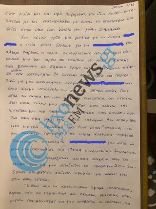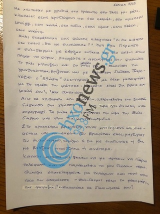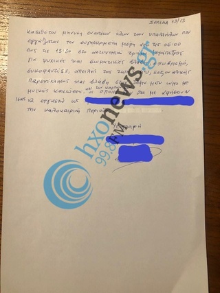 Καταθέτω μήνυση εναντίων όλων των υπαλλήλων που εργάζονταν τη συγκεκριμένη μέρα από τις 06.00 εως τις 13.30 στο αστυνομικό τμήμα Ιεράπετρας για ψυχικές και σωματικές βλάβες , εξυβρισμό , συκοφαντίες απειλή στη ζωή μου σεξουαλικής παρενόχλησης και βλάβης στον δεξιό μου ώμο με μυικές κακώσεις και των καρπών μου οι οποίες δεν θα με αφήσουν ίσως να εργαστώ ως ….. ….. την καλοκαιρινή περίοδο».