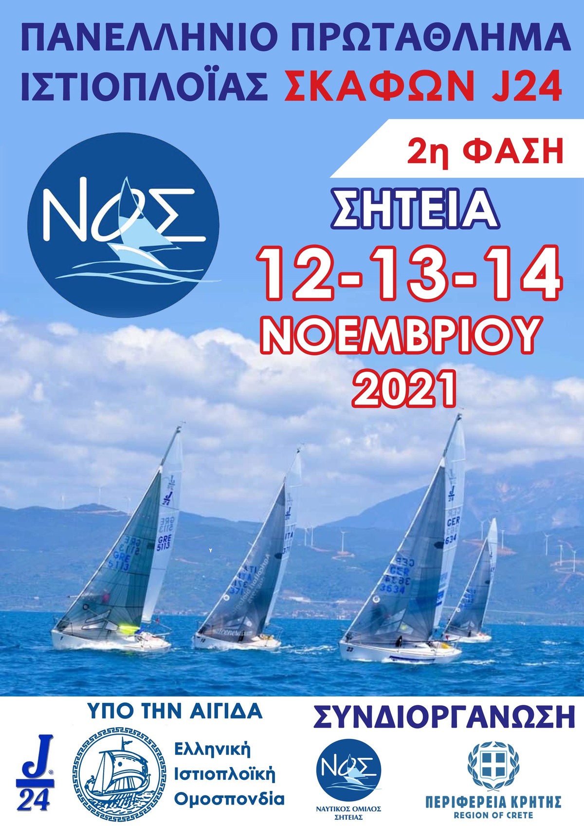 Με τη συνδιοργάνωση της Περιφέρειας Κρήτης, ο Ναυτικός Όμιλος Σητείας διοργανώνει το Πανελλήνιο Πρωτάθλημα Ιστιοπλοΐας της κλάσης J/24 που θα διεξαχθεί στην ευρύτερη περιοχή του Λιμανιού της Σητείας στις 12-13-14 Νοεμβρίου 2021, όπως είναι ενταγμένος στο επίσημο πρόγραμμα Ιστιοδρομιών της Ε.Ι.Ο. για το τρέχον έτος.