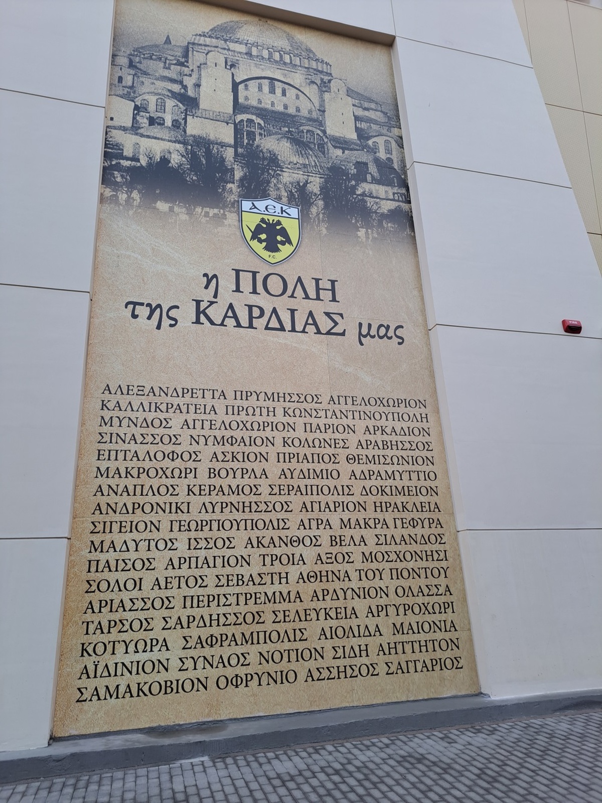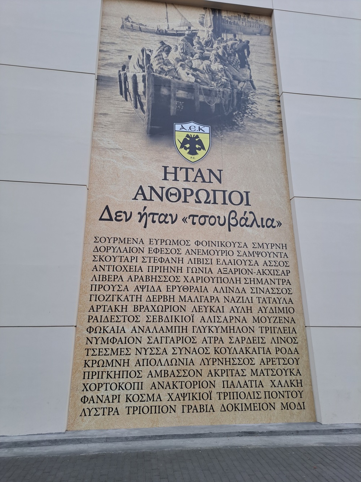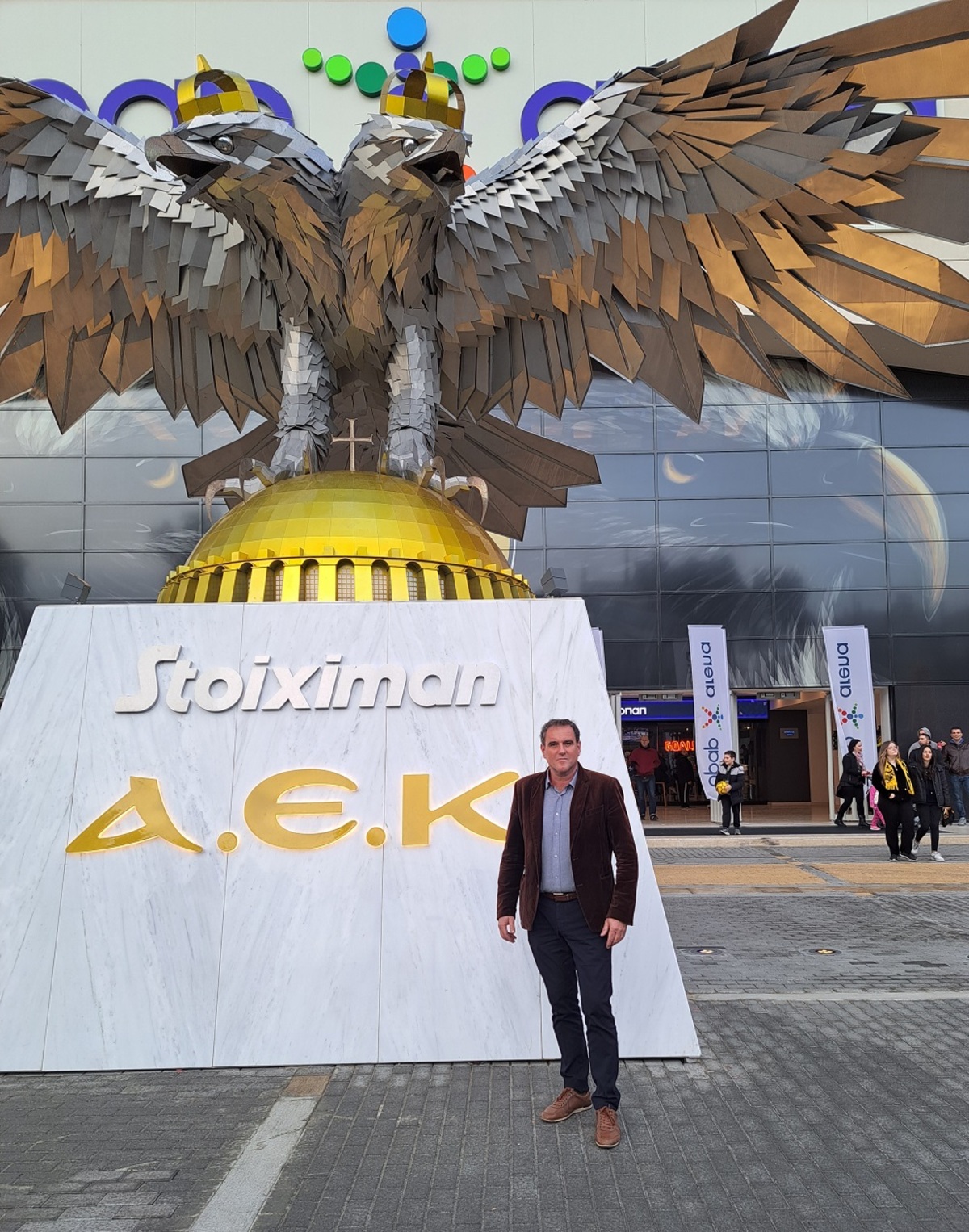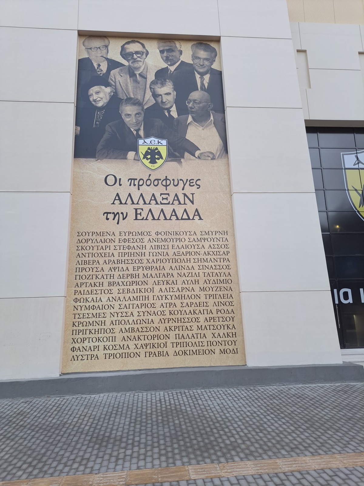 Στην συνέχεια ο κ. Πανταζής βρέθηκε στις εγκαταστάσεις του νέου εμβληματικού γηπέδου της ΑΕΚ όπου από μόνο του το έργο αυτό είναι ένα ιστορικό μουσείο, με έντονο το στοιχείο της αρχιτεκτονικής της Αγίας Σοφίας. Το σημαίνον κτίριο κοσμούν εξωτερικά τεράστιες φωτο-τοιχογραφίες με αναφορές στους Μικρασιάτες και τη διαδρομή τους. Αναφορές όπως, Αιώνιος σεβασμός στη μάνα της προσφυγιάς, δε θα ξεχάσουμε ποτέ, τί να ξεχάσω από όσα πέρασα, οι πρόσφυγες αλλάξαν την Ελλάδα και άλλες. Είναι αναπόφευκτη η αναφορά στην εγκατάσταση γλυπτού μεταλλικής κατασκευής που απεικονίζει τον δικέφαλο αετό, έργο του Ούγγρου γλύπτη Gábor Miklós Szőke (Γκάμπορ Μίκλος Ζόκε) στην προαύλια πρόσοψη του γηπέδου στη Νέα Φιλαδέλφεια. Είναι μια κατασκευή που παριστάνει έναν εστεμμένο δικέφαλο αετό με τα δύο κεφάλια σε στάση επίθεσης, με ανοιχτά ράμφη, ενώ γίνεται ξεκάθαρη αναφορά στην Ελληνορθόδοξη παράδοση καθώς το γλυπτό εδράζεται σε κυκλικό θόλο, που αντιγράφει αυτόν της Αγία Σοφίας στην Κωνσταντινούπολη.