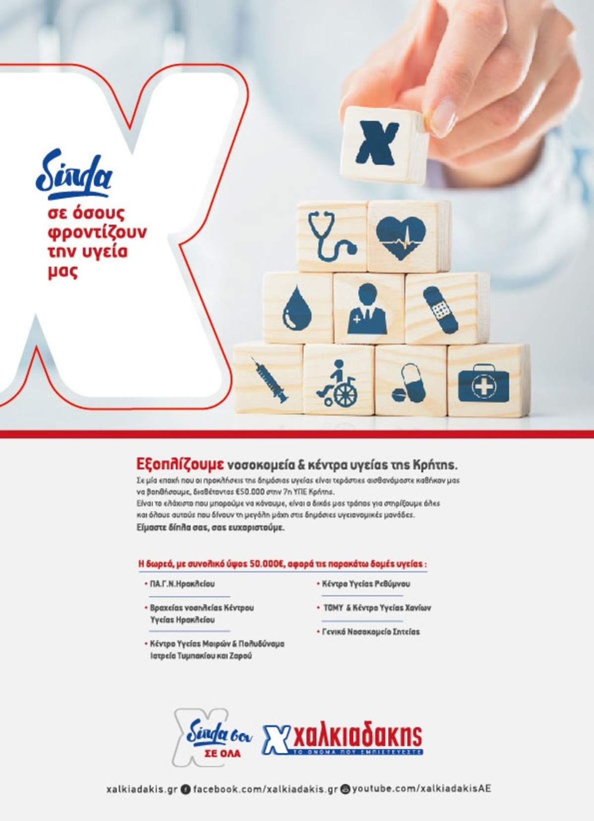 Η μεγάλη δράση δωρεάς ιατρικού και τεχνολογικού εξοπλισμού στις Δομές Υγείας της Κρήτης από την Χαλκιαδάκης Α.Ε., μια δωρεά συνολικού ύψους 50.000 ευρώ, ολοκληρώθηκε με επιτυχία. Η δράση, η οποία εντάσσεται στο πλάνο Εταιρικής Κοινωνικής Ευθύνης της Χαλκιαδάκης Α.Ε. και υλοποιείται με τη συνεργασία της 7ης Υγειονομικής Περιφέρειας Κρήτης, έχει ως στόχο να ενισχύσει την προσπάθεια που καταβάλλεται από το υγειονομικό προσωπικό στις Δομές του τόπου μας και να καλύψει βασικές ανάγκες, όπου αυτές εντοπίζονται.