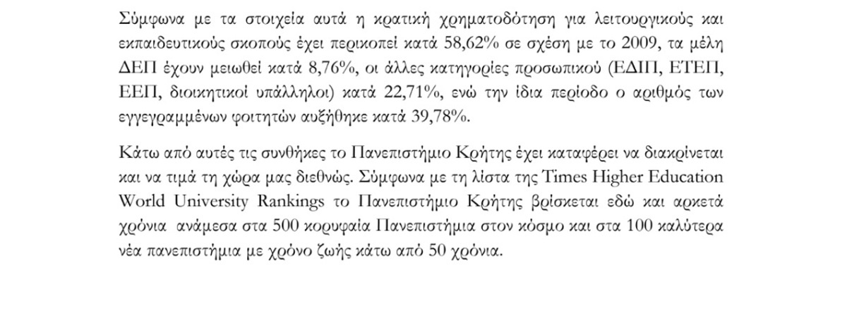 "Το Πανεπιστήμιο Κρήτης, και το ελληνικό δημόσιο πανεπιστήμιο γενικότερα, χρήζει άμεσης γενναίας ενίσχυσης από την ελληνική Πολιτεία τόσο όσον αφορά στον προϋπολογισμό του όσο και σε ανθρώπινο δυναμικό για να μπορέσει να συνεχίσει να επιτελεί απρόσκοπτα το έργο του, να στηρίζει την ελληνική κοινωνία και να τιμά τη χώρα μας διεθνώς. Η ίδρυση ιδιωτικών πανεπιστημίων, εκτός του ότι παρακάμπτει το άρθρο 16 του Συντάγματος, δεν αναμένεται να λύσει κανένα από τα παραπάνω προβλήματα", τονίζεται χαρακτηριστικά.