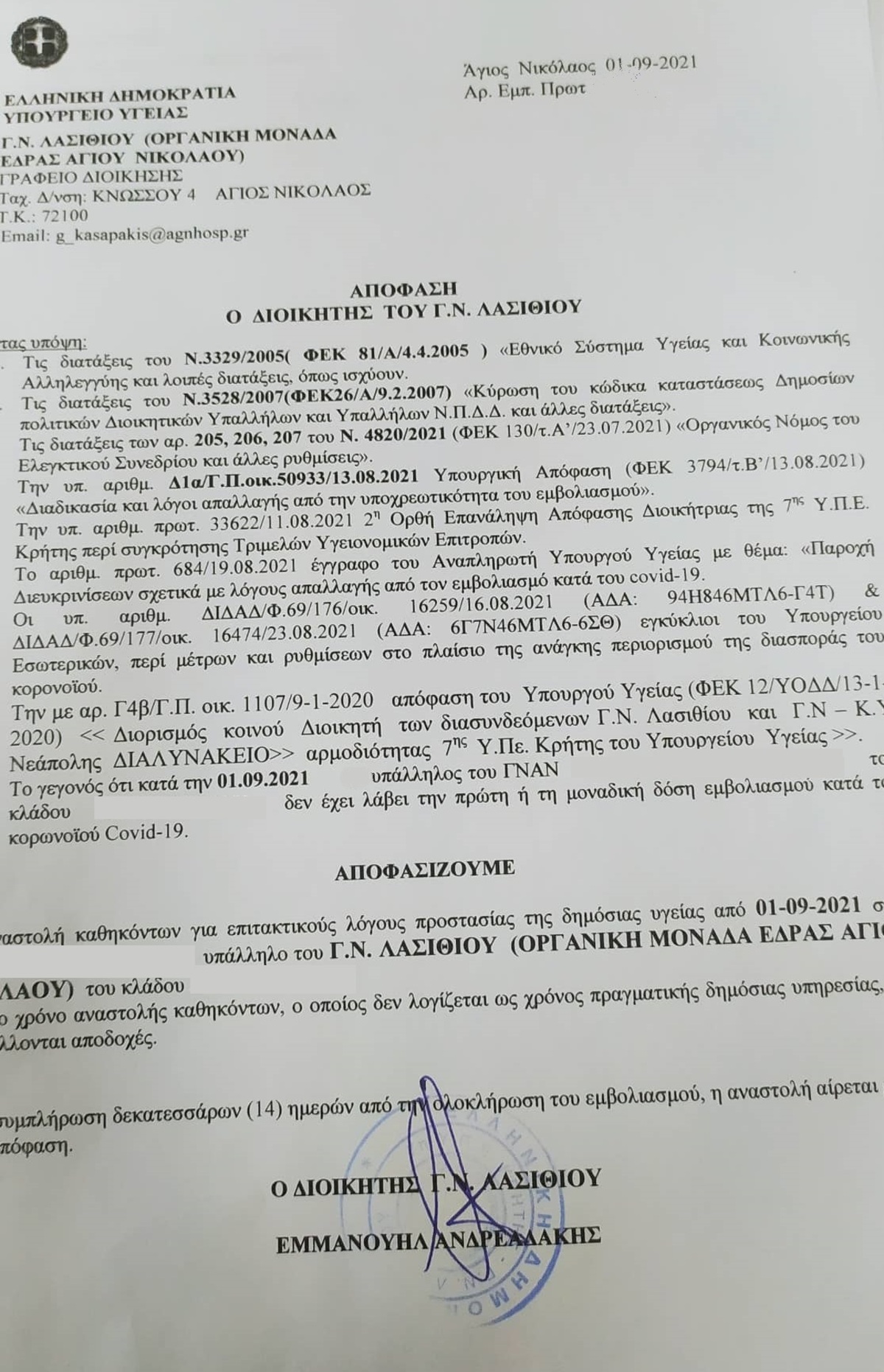Τελικά υπέγραψε 33 πράξεις αναστολής εργασίας σε συναδέλφους (το ΚΨΥ πήρε παράταση μέχρι 15/9) οι οποίοι από σήμερα απομακρύνθηκαν από την εργασία τους χωρίς πλέον αποδοχές.