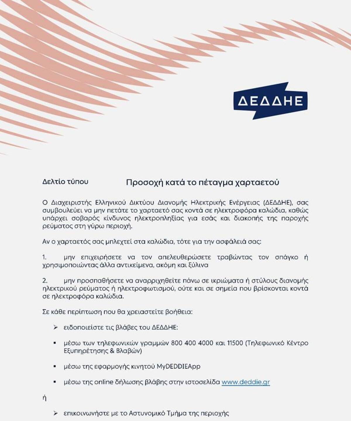 Συμβουλές από τη ΔΕΔΔΗΕ για το πέταγμα του χαρταερτού ΛΑΣΙΘΙ ΙΕΡΑΠΕΤΡΑ 8:32 π.μ. - Πέμπτη, 3 Μαρτίου 2022 08:03 π.μ. - Πέμ, 03/32/2022 ΔΕΔΔΗΕ, ΠΕΤΑΓΜΑ ΧΑΡΤΑΕΤΟΥ Μην πετάτε το χαρταετό κοντά σε ηλεκτροφόρα καλώδια